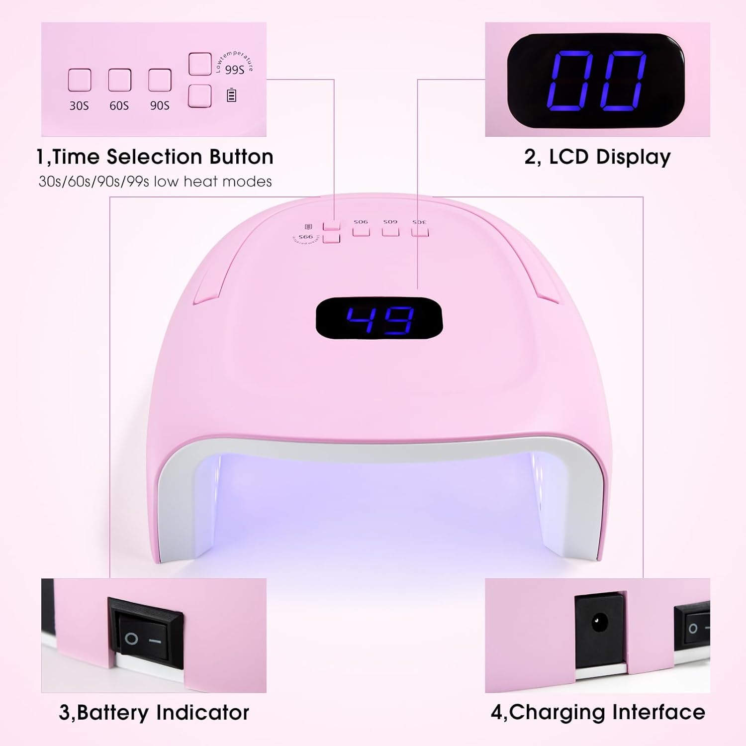 • Automatic Sensor & 4 Timer Setting: The rechargeable uv led nail lamp has a auto hand infrared sensor. It will automatically start when hands get in and automatically shut down when hands out or timer finish. The rechargeable gel led nail lamp has 4 timer setting, 30s,60s,90s,99s. Dry your nail gel seconds