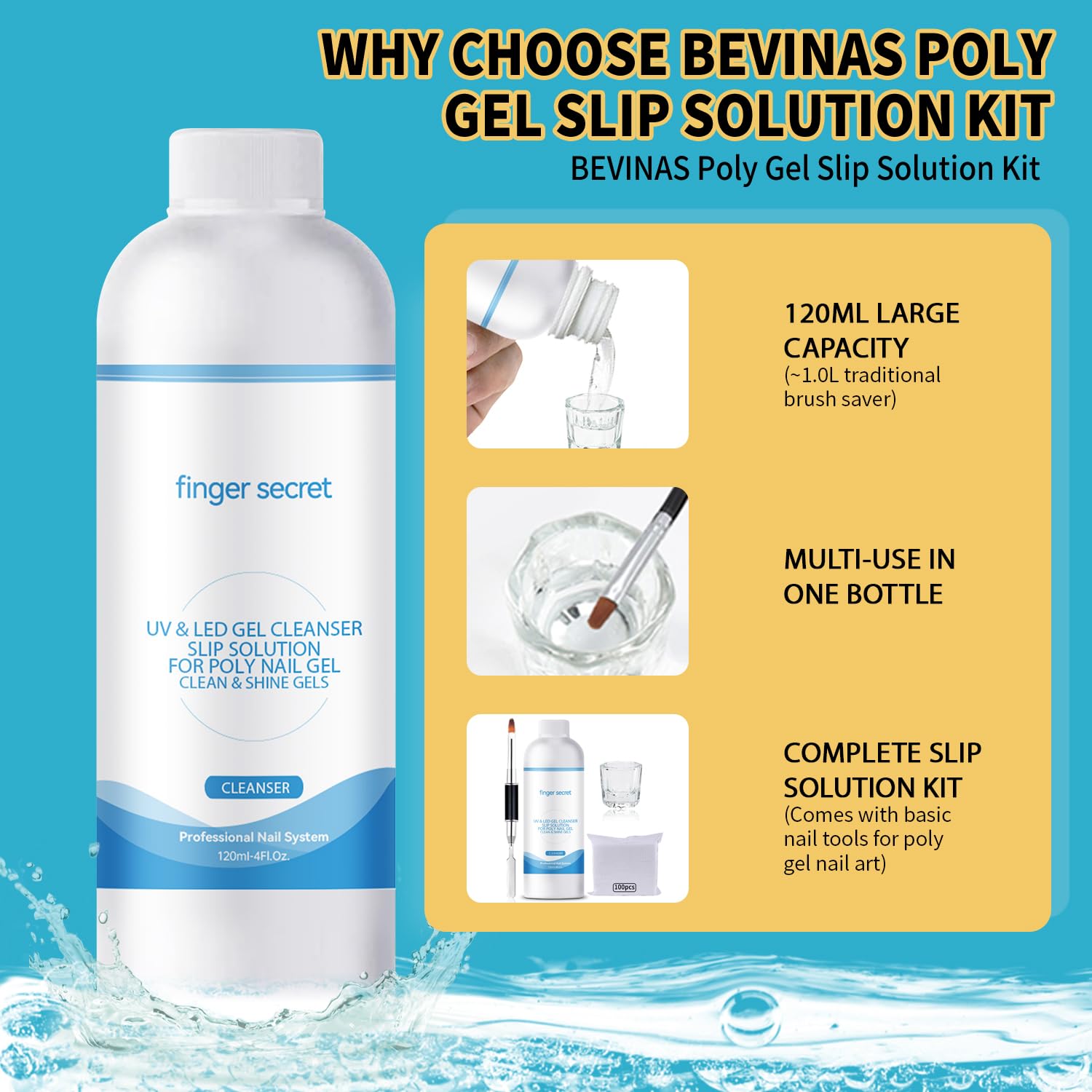 • 【BEVINAS 4Fl.Oz SLIP SOLUTION UTILITY KIT】BEVINAS slip solution kit included a 4Fl.Oz slip solution for poly nail gel,a brush spatula, a glass cup, 100 nail cleaning pads. The slip solution evenly coats the poly gel, making it easier to mold and longer lasting.Suitable for home DIY salon beginners.