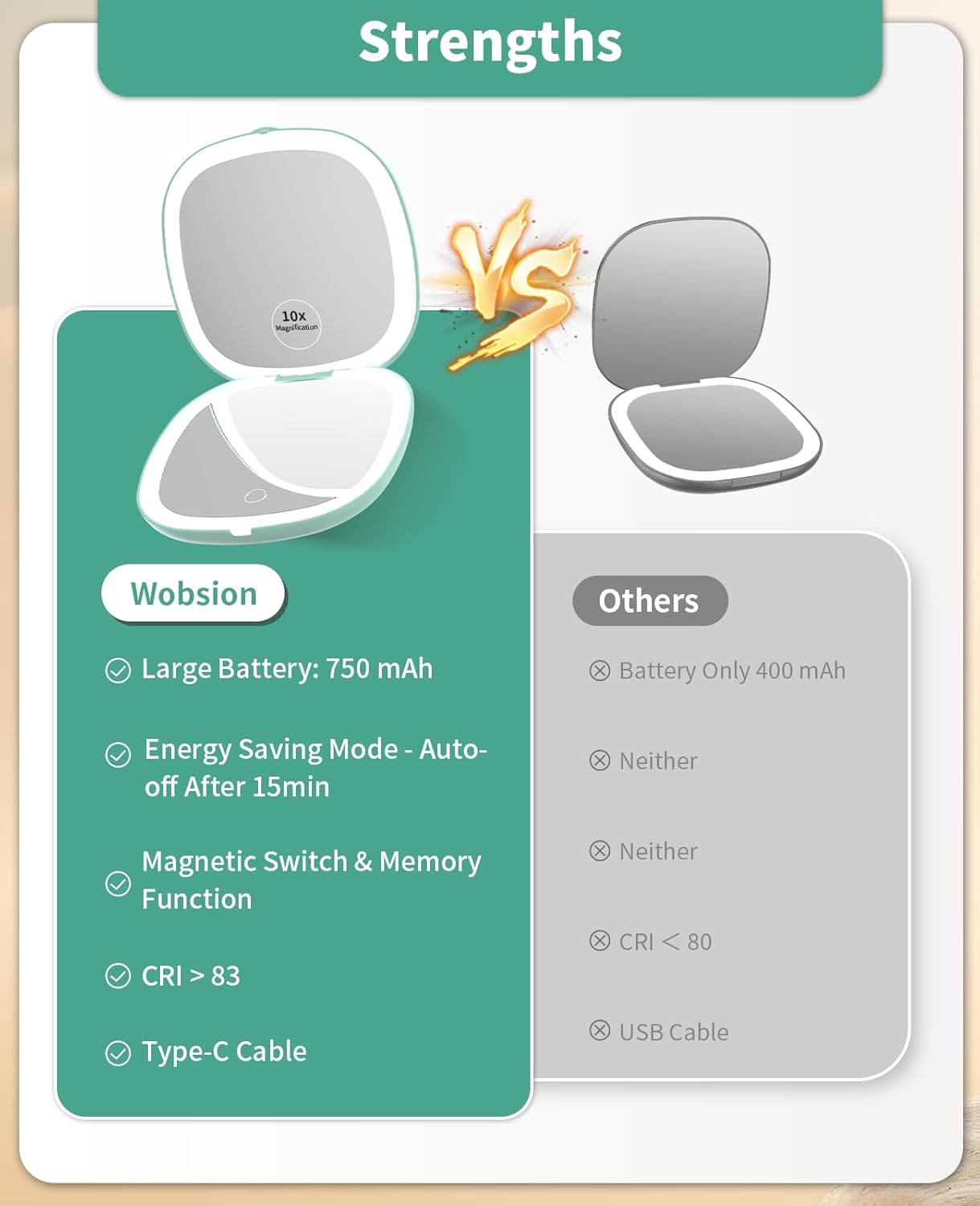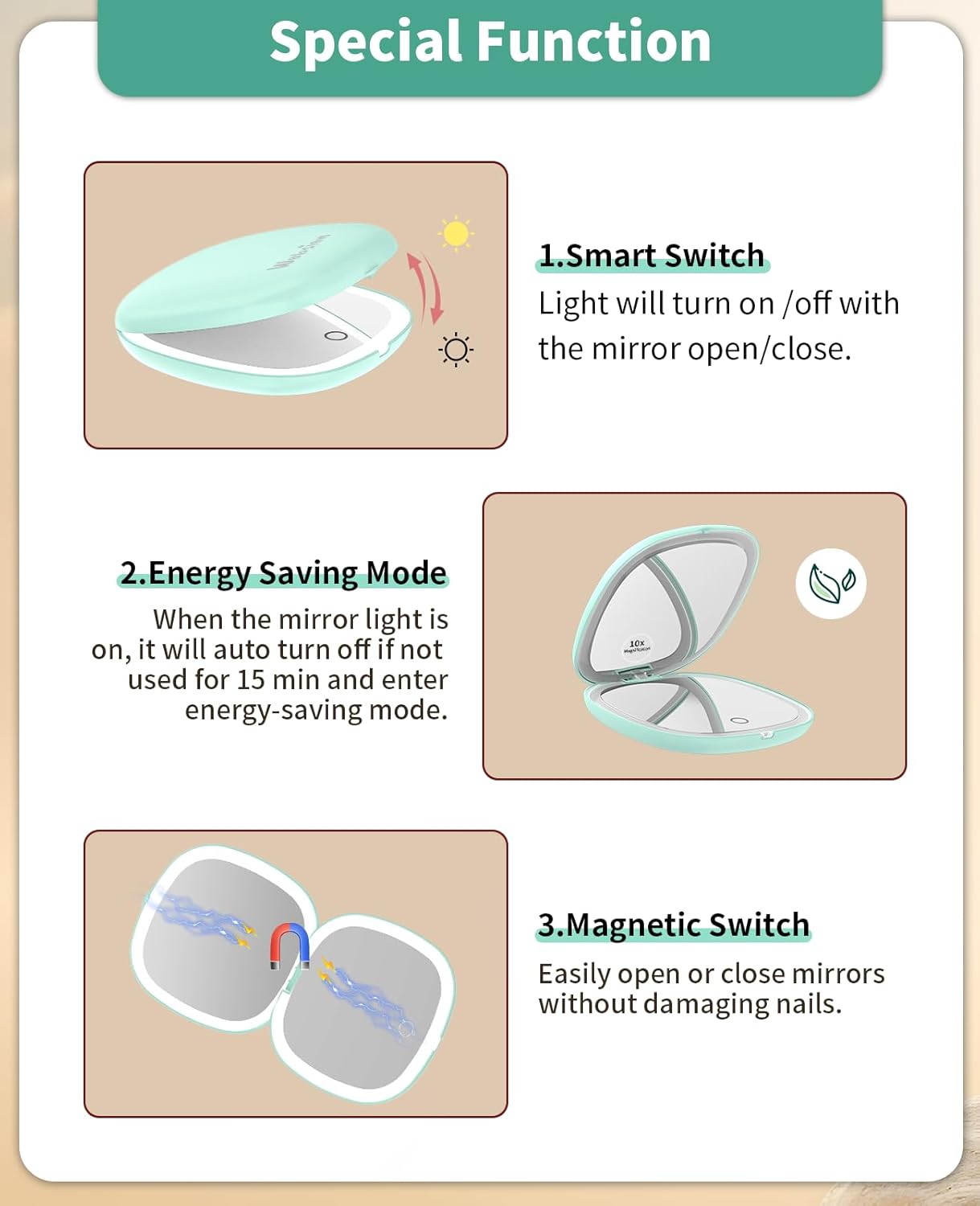 • 10x Magnifying:One side is a 1x HD mirror, equipped with white light to better restore your beauty, and the other side is a 10x magnifying mirror, which can help you magnify facial details. Tip: When using the 10x magnifying mirror, please keep a distance of less than 10 cm, otherwise it may cause normal dizziness and affect imaging