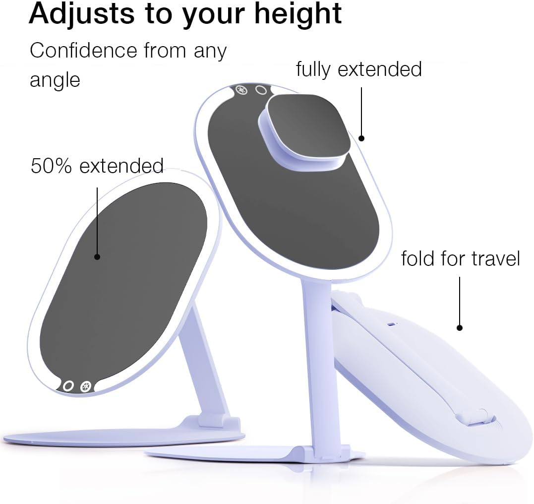 • Adjustable Height – Our travel mirror effortlessly transitions from handheld to vanity, allowing you to find the perfect viewing angle at various heights. No more uncomfortable hunching!