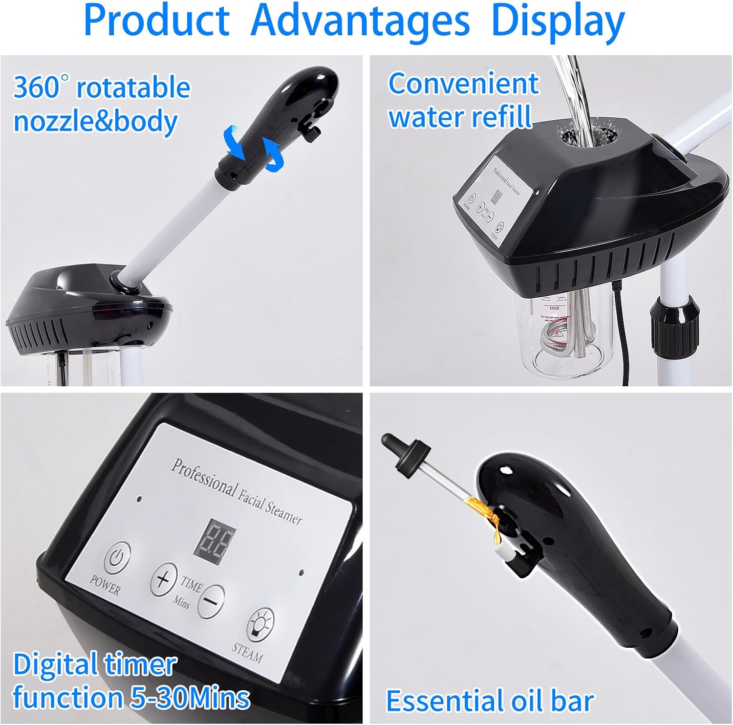 • 【Facial Steamer Adjustable】This height of this face steamer for facial deep cleaning can be adjusted from 36~52 inches, with a 360° rotated nozzle and a 360° rotated main body, 360° rotatable wheels, which is very suitable for spa or home personal care.