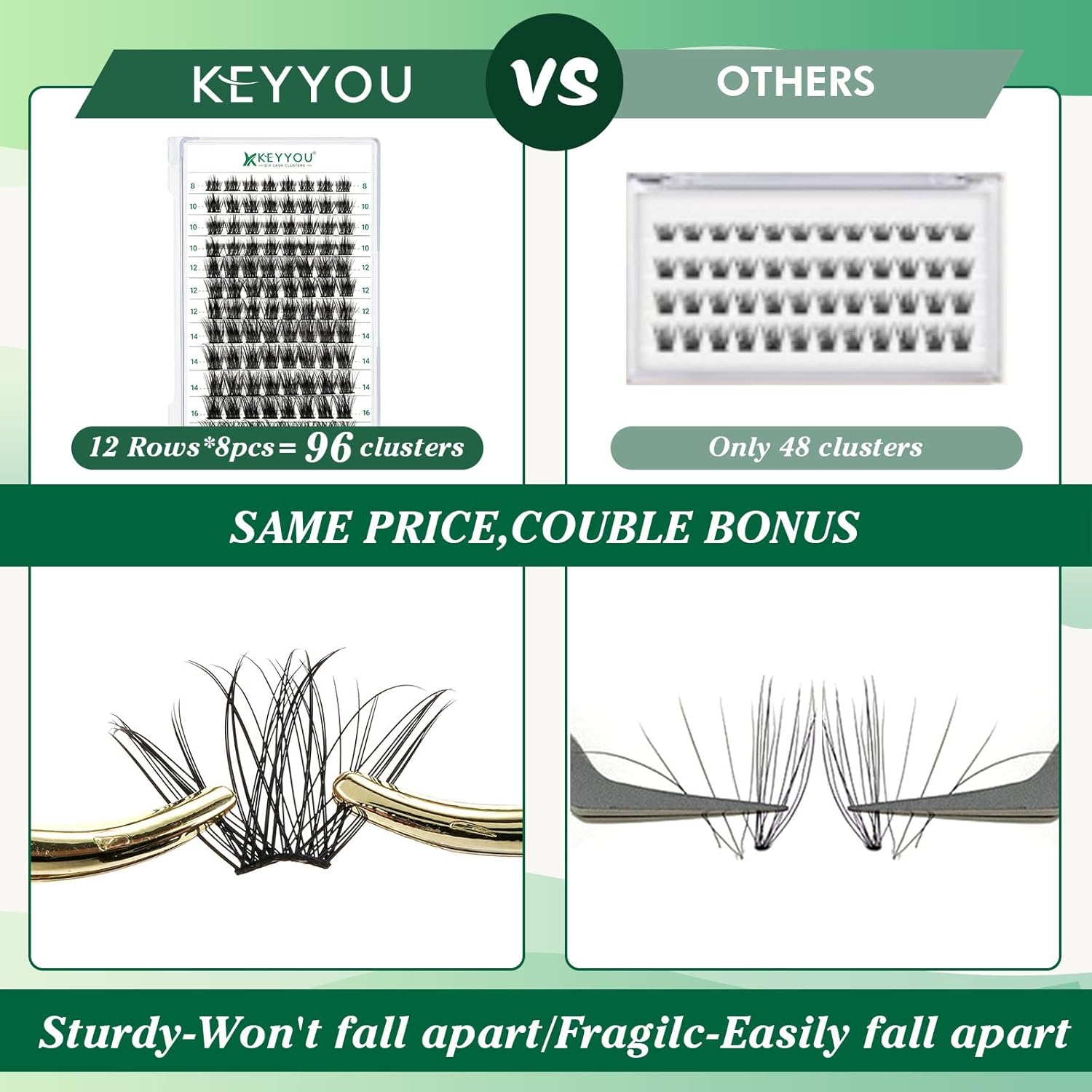 • 【Soft&Comfortable】KEYYOU lash cluster are made of imported materials,the stem line is thinner and softer, the eyelash cluster are lighter and more comfortable to wear.96 clusters in one tray ,more cost-effective.