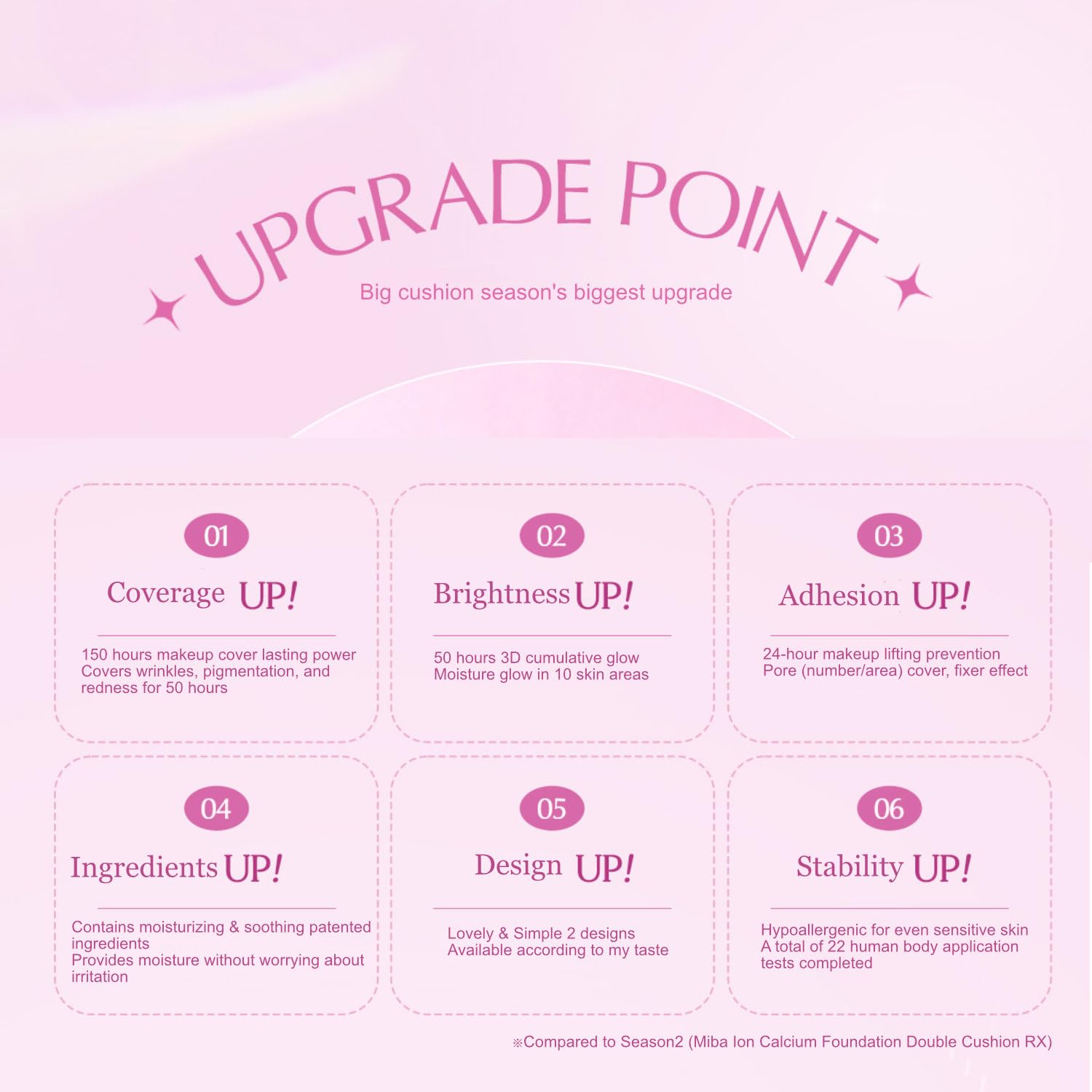 • [Coverage UP!] Long lasting makeup cover Covers pigmentation and redness for a long time [Glowing power UP!] Moisture and glow in 10 areas of the skin [Adhesion UP!] Prevents makeup from flaking off for 24 hours Covers pores (number/area), fixer effect [Ingredients UP!] Contains moisturizing & soothing patented ingredients Provides moisture without worrying about irritation [Design UP!] Two designs: Lovely & Simple [Stability UP!] Hypoallergenic considering even sensitive skin
