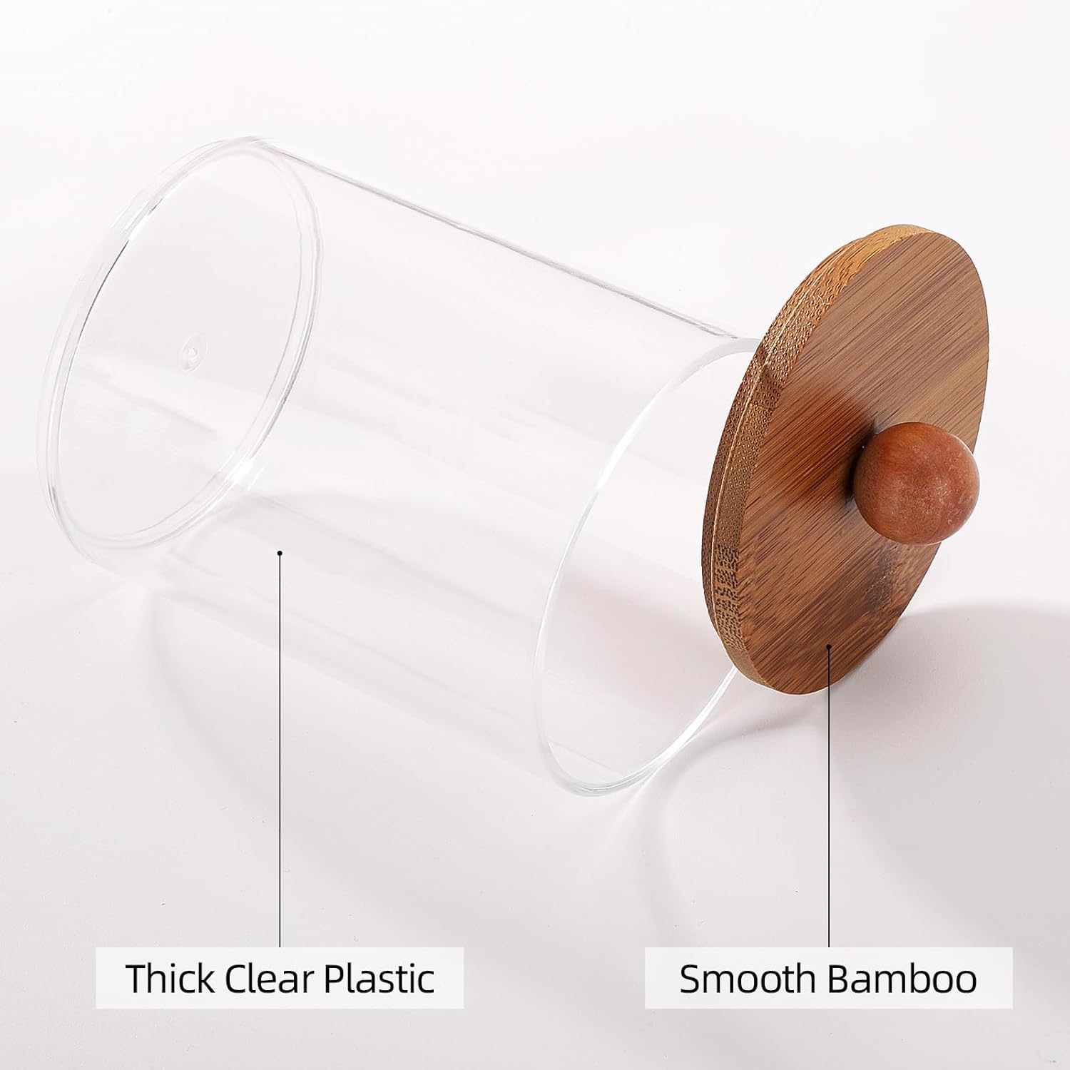 Tbestmax 4 Pack Qtip Holder Dispenser, Plastic Bathroom Organizer and Storage Containers, 10oz Apothecary Jars with Brown Bamboo Lid for Cotton Ball, Cotton Swab, Floss