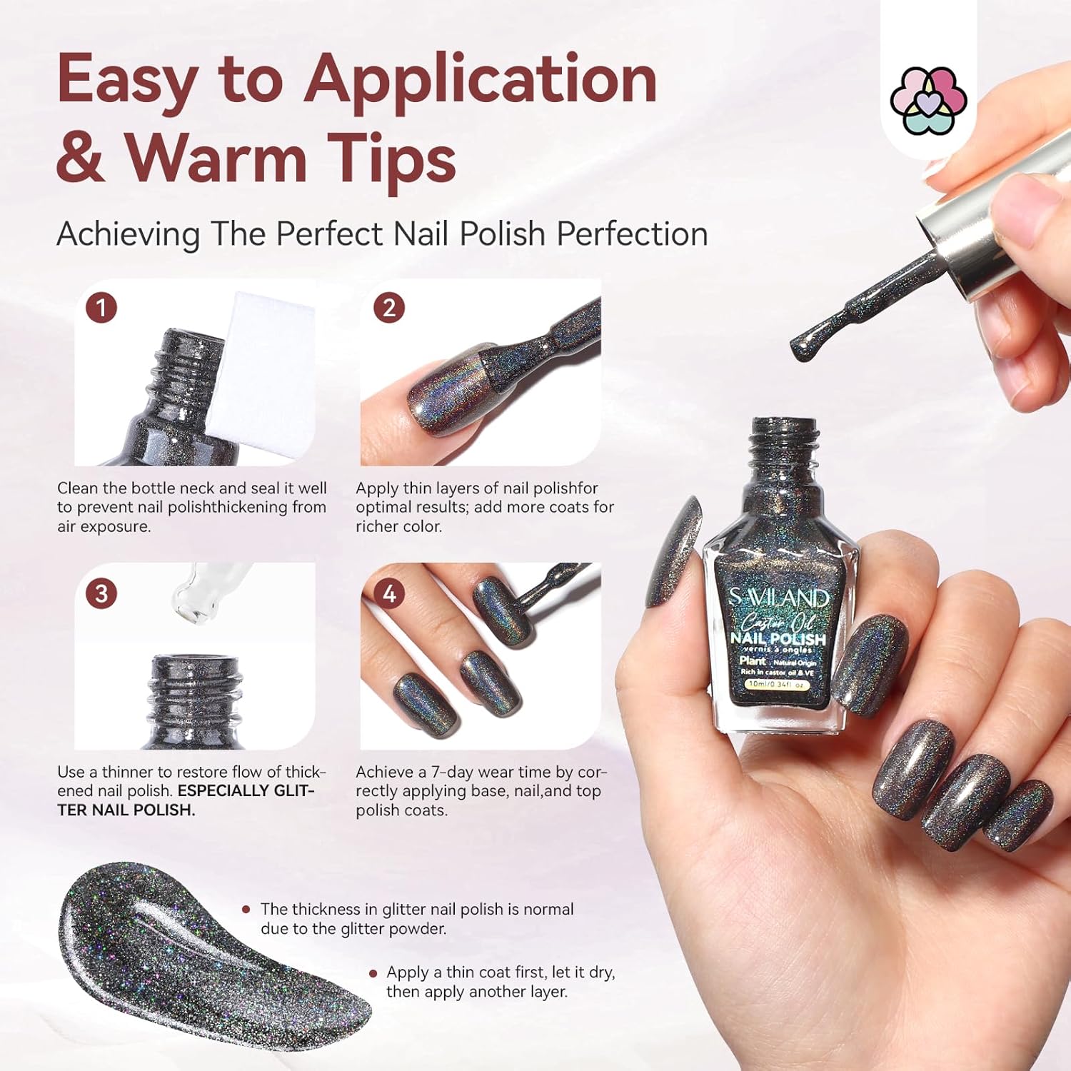 • Plant-Based Healthy Ingredients: SAVILAND holographic metallic fingernail polish is formulated with specially added castor oil, which is known for strengthening and improving nail structure, so you can say goodbye to brittle nails