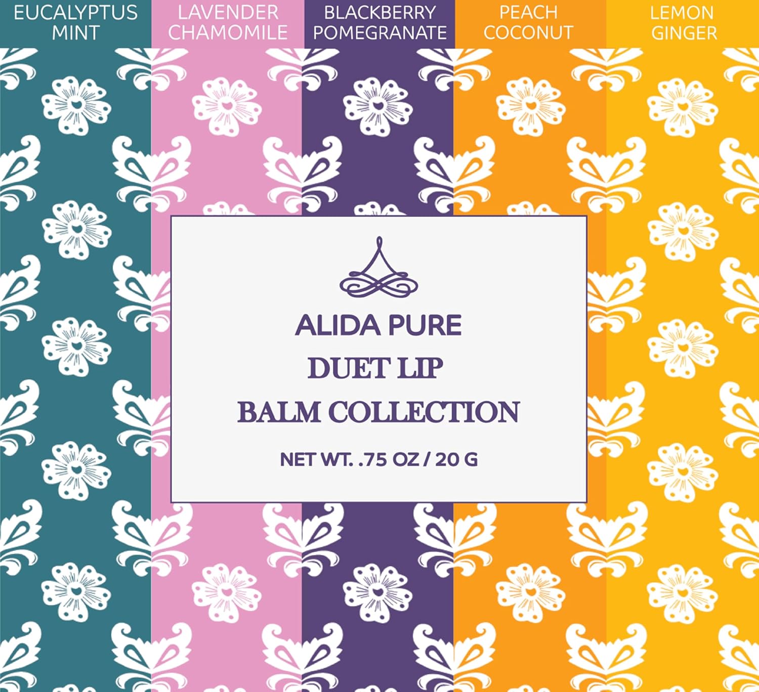 • ALIDA PURE Duet Lip Balm Collection is made with cruelty free, hypoallergenic, organic, and natural oils, that protect, and soothe. The delicious, nourishing, and moisturizing, Duet Lip Balm Collection includes a .15-ounce lip balm tube of Eucalyptus Mint, Lavender Chamomile, Blackberry Pomegranate, Peach Coconut, and Lemon Ginger lip balms. Thoughtfully packaged with biodegradable materials that support the environment.