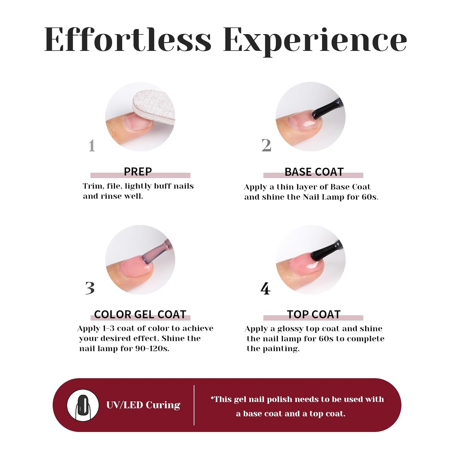 • 🎨Speed Curing with LED Nail Lamp: The gel nail polish kit need to be cured under LED light. Base and Top coat required. Average for LED light 60-120 secs.