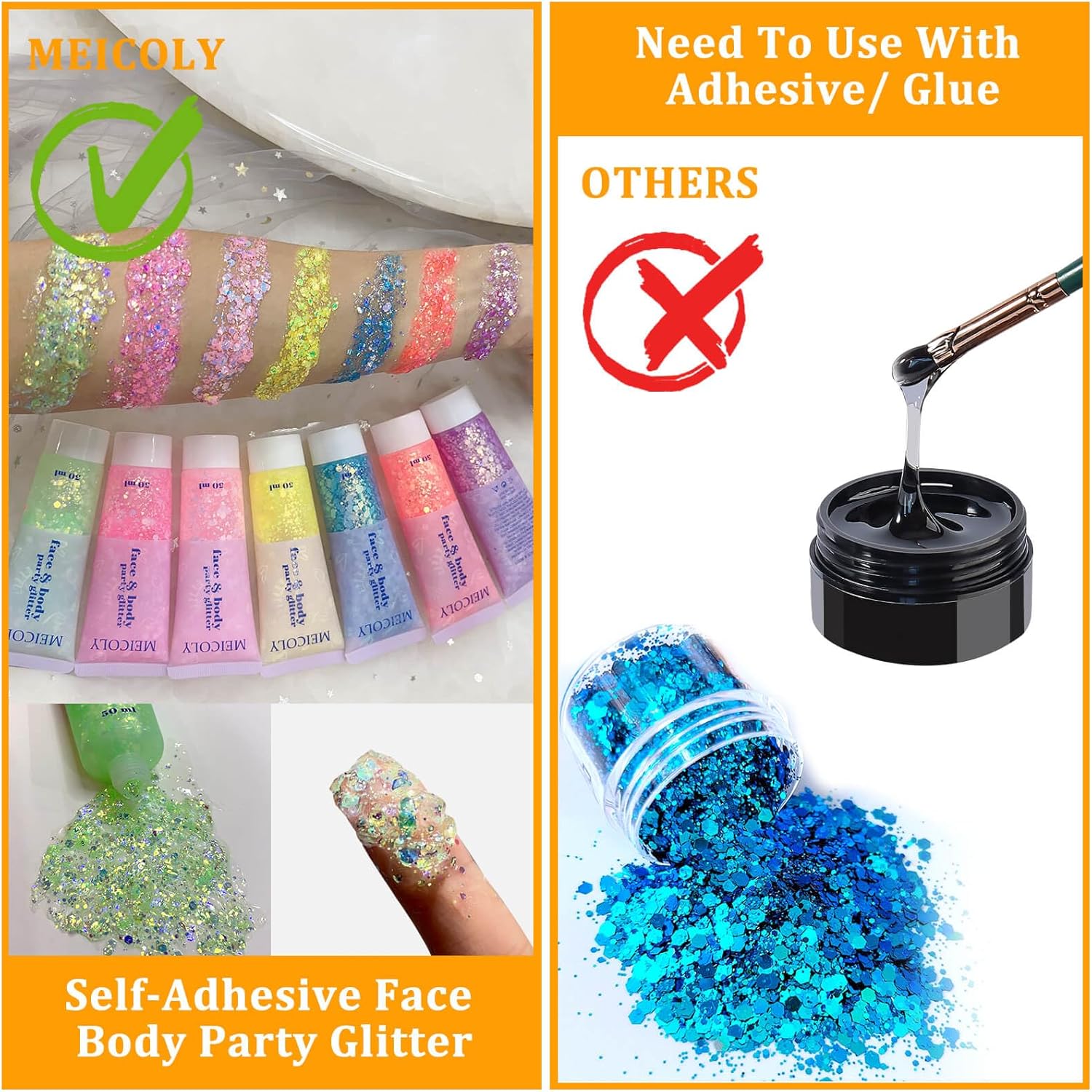 • Safe Ingredients:All MEICOLY color changing body glitter is made with cosmetic grade material,the glitter is kind to skin,no irritation when wearing it.Also vegan and cruelty-free,not obtain the formula from animal