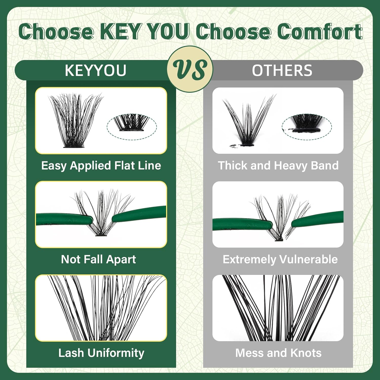 • 【Super Soft&Comfortable】KEYYOU new lash clusters made with softer updated materials, it is lighter and more comfortable to wear, and can be worn all day without burden, making the beauty last longer.The lashes clusters with super thin roots allow you to better fit your natural eyelashes.