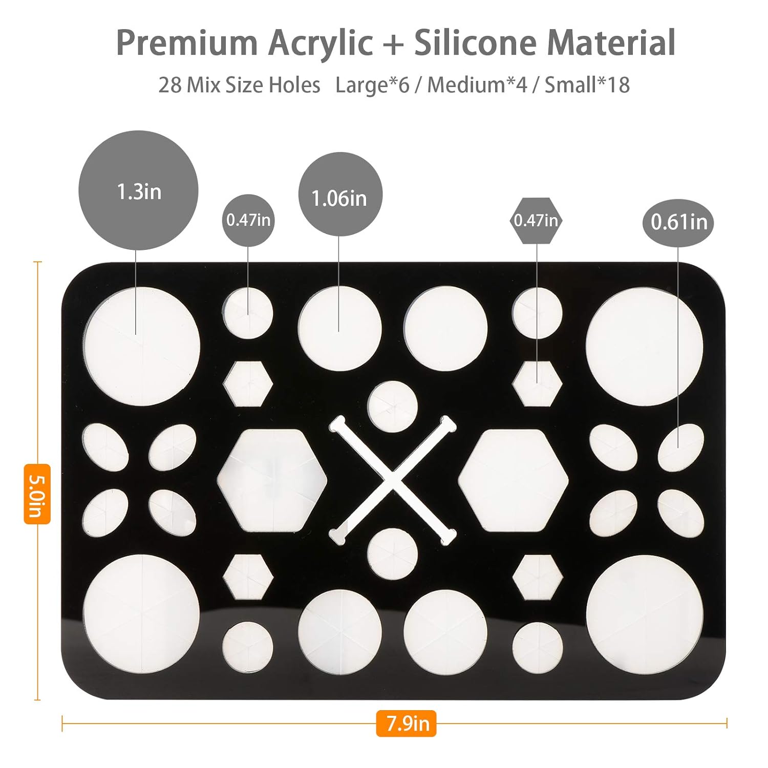 • 28 slots with various sizes for holding all types of brushes. Small, medium and large. No worries about them falling out. And also work for artist brushes, nail acrylic brushes, paintbrushes and so on, very practical