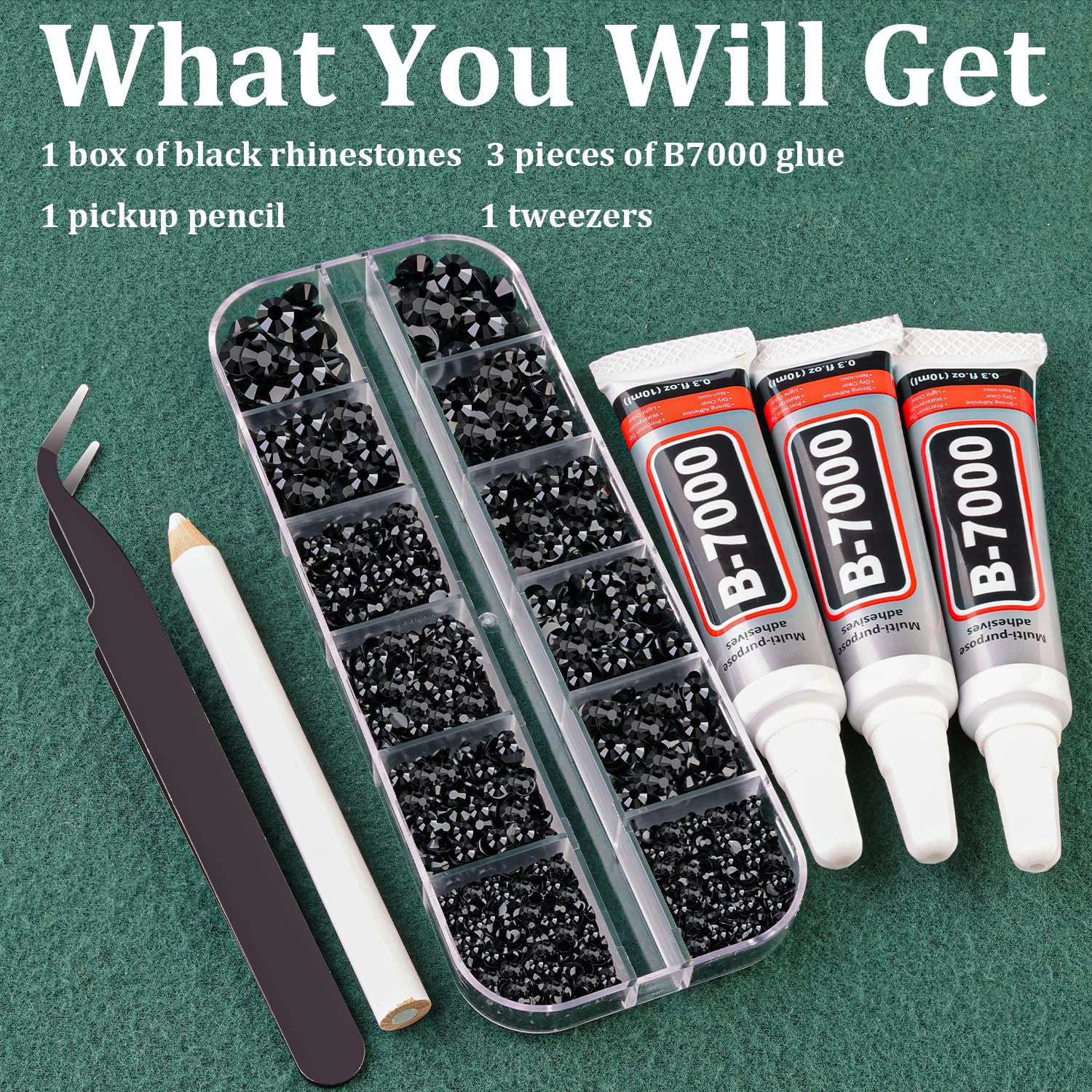 Resin Rhinestones for Crafting with B7000 Jewelry Glue, 1 Box Black Flatback Crystals with 3Pcs 10ml Glue for Bedazzling Crafts DIY Nail Art Makeup,Non Hotfix Gems for Clothing Shoes