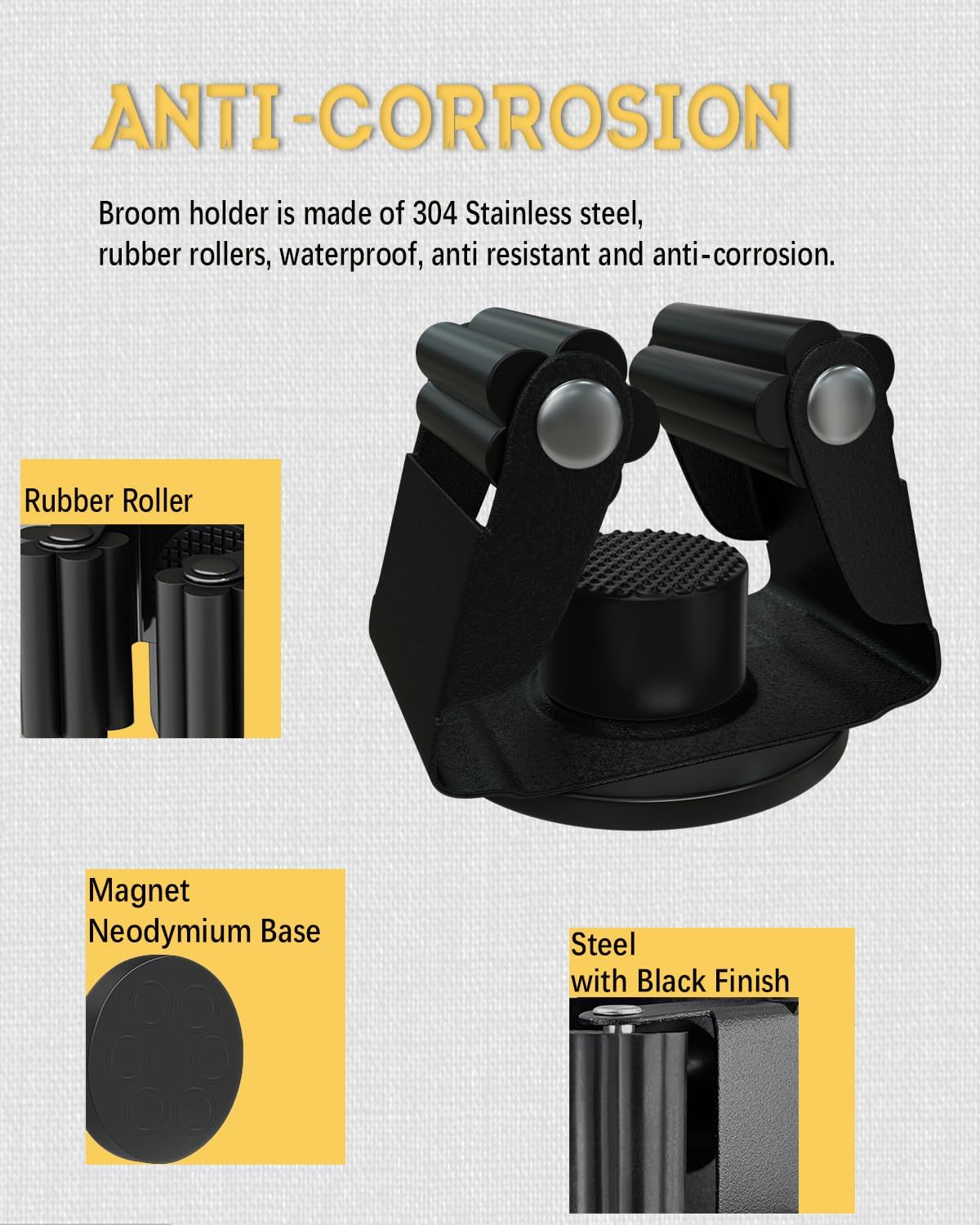 • Steel material: magnetic mop broom holder is made of sus304 stainless steel; anti corrosion and tarnishing; adapting rubber roller; building to resist daily scratches; much strong and sturdy than plastic one in the market