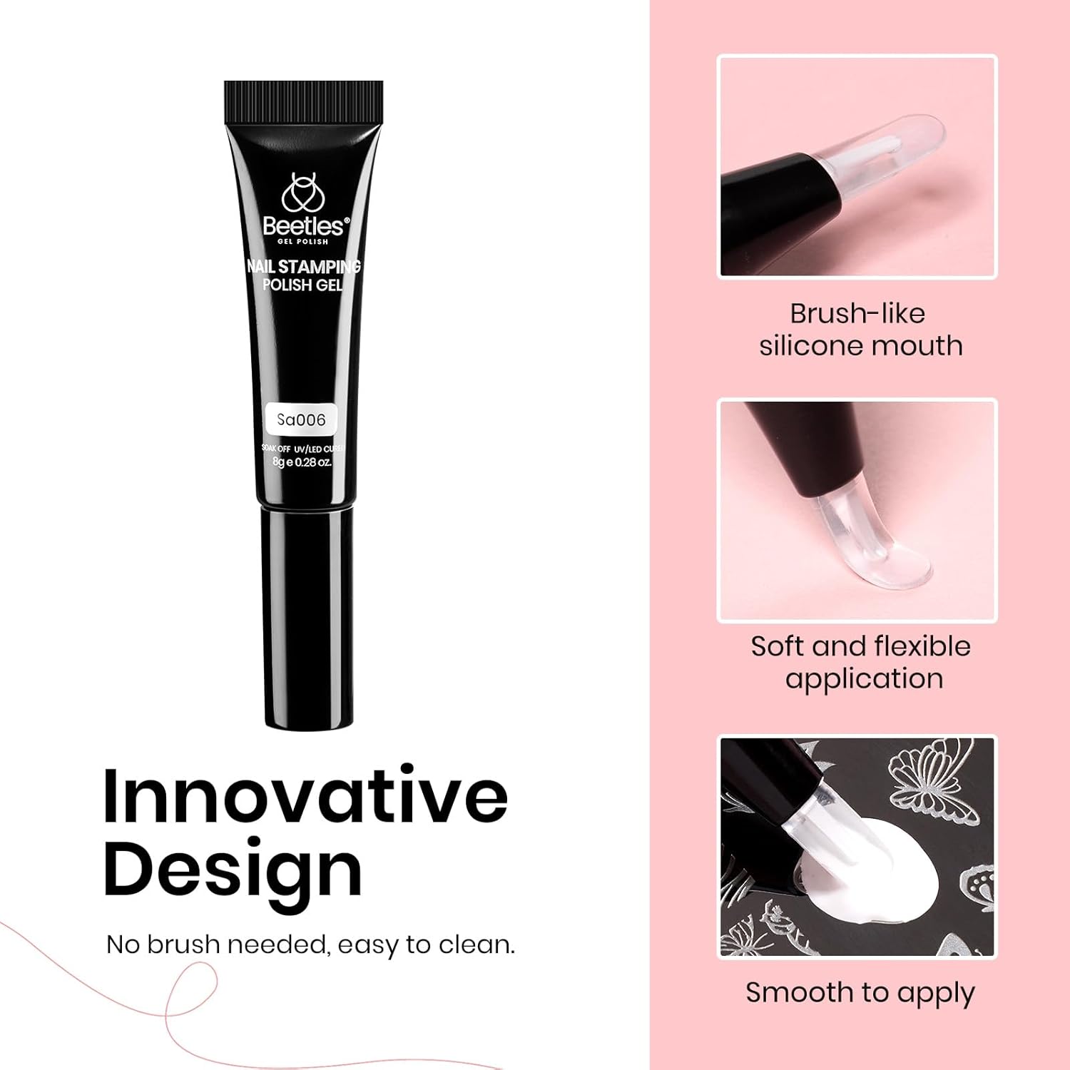 • Beetles French Tip Tool: This Stamp Gel Silicone Nail Stamp Kit, perfect for Home Manicure Diy Nail Salon, includes nail stamping polish gel 8g*2, liquid peel-off latex tape*1,long silicone stamper*1. You can take your favorite patterns on the scraper and then stamp. This nail art printing tool helps you to DIY nail art easily and quickly.