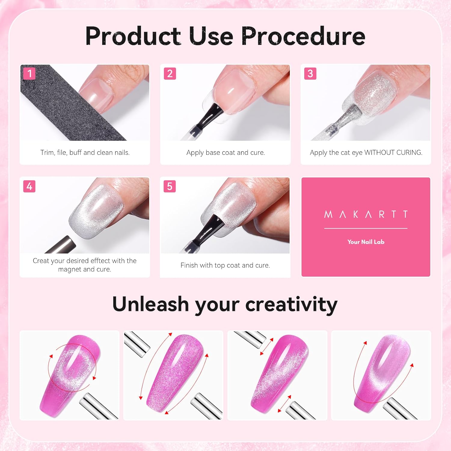 • Magnetic Cat Eye Effects: Makartt cat eye gel nail polish with magnet creates holographic effects. This 10ml silver polish shifts under different lighting. Follow tutorials for various captivating styles.