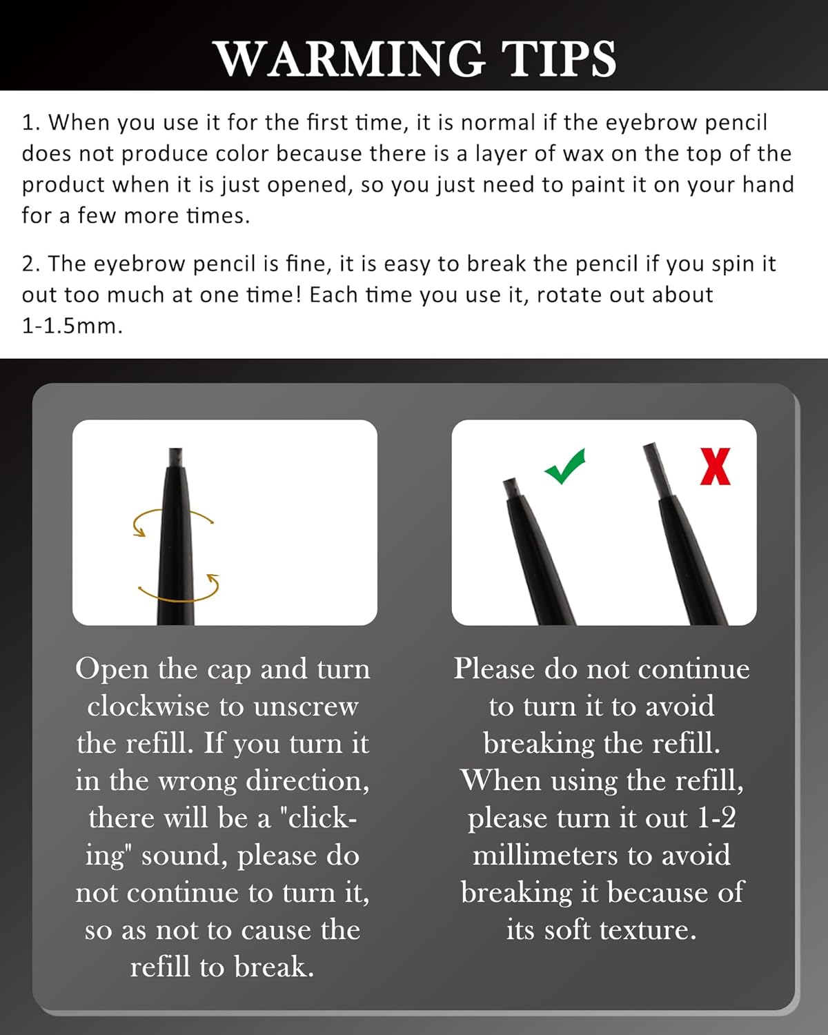 • RETRACTABLE & EASY TO USE - This retractable eyebrow pencil can be rotated out to the proper length, and to prevent accidental breakage, it is best to use it with the tip protruding less than 0.2 mm. It applies smoothly and conveniently. Ideal for makeup beginners and professionals. It is very easy to use, simply twist up the pencil slightly until the tip reaches the tip, draw small strokes and then use the brush on the other end to comb through your eyebrows and fill in sparse areas and gaps.
