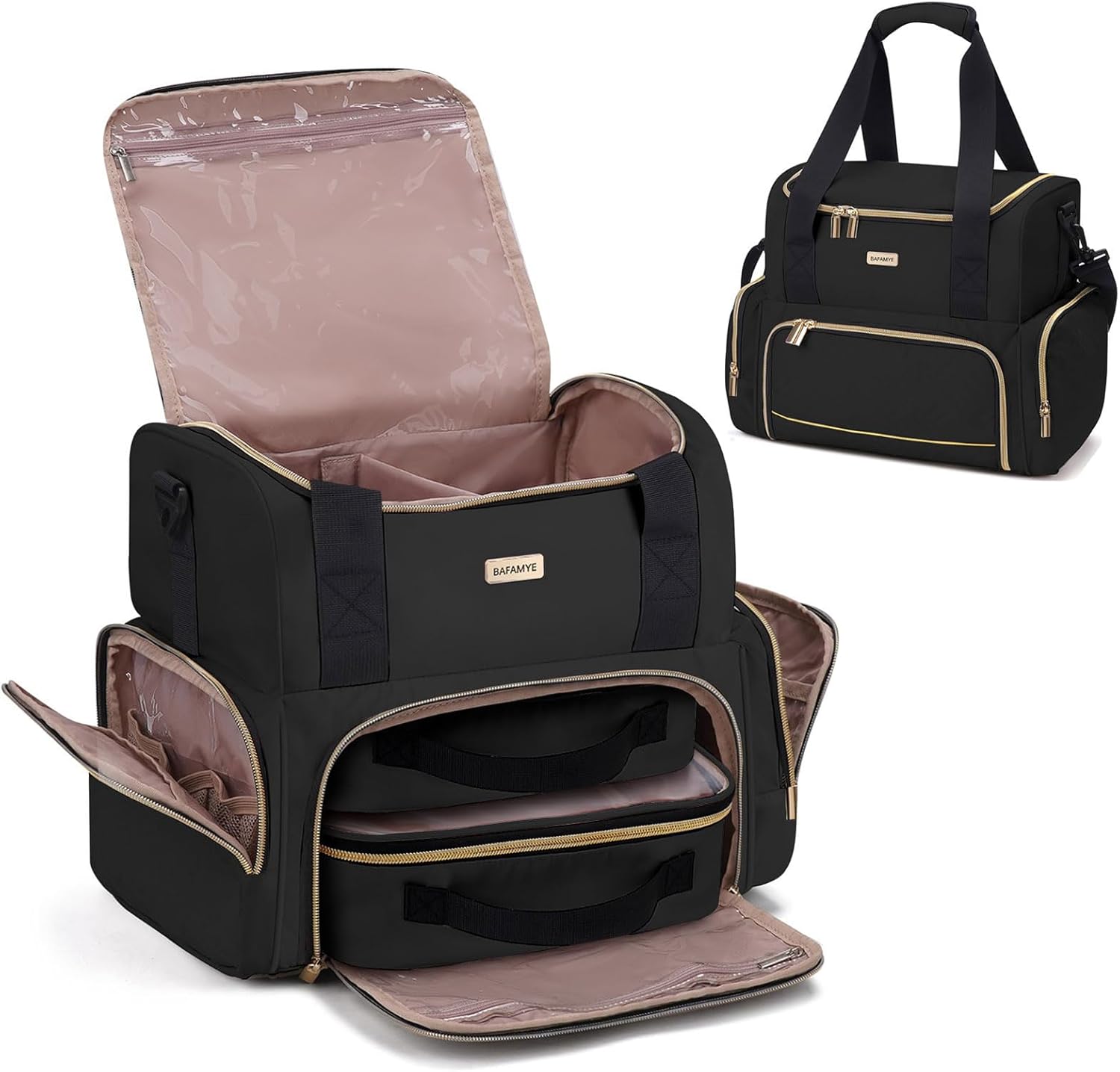 • LARGE CAPACITY: Dimensions 14.2x9.1x11.8in. The travel cosmetic case features double-layer design and multiple storage to organize your all cosmetics. Top compartment comes with detachable dividers for convenient customization to your storage needs