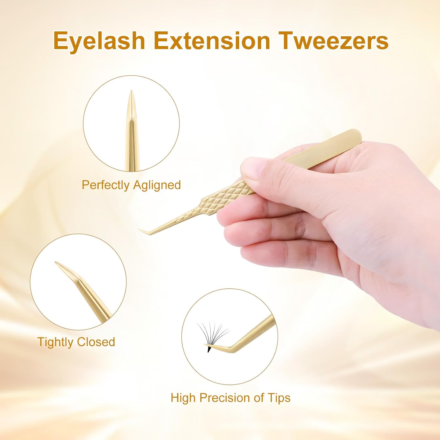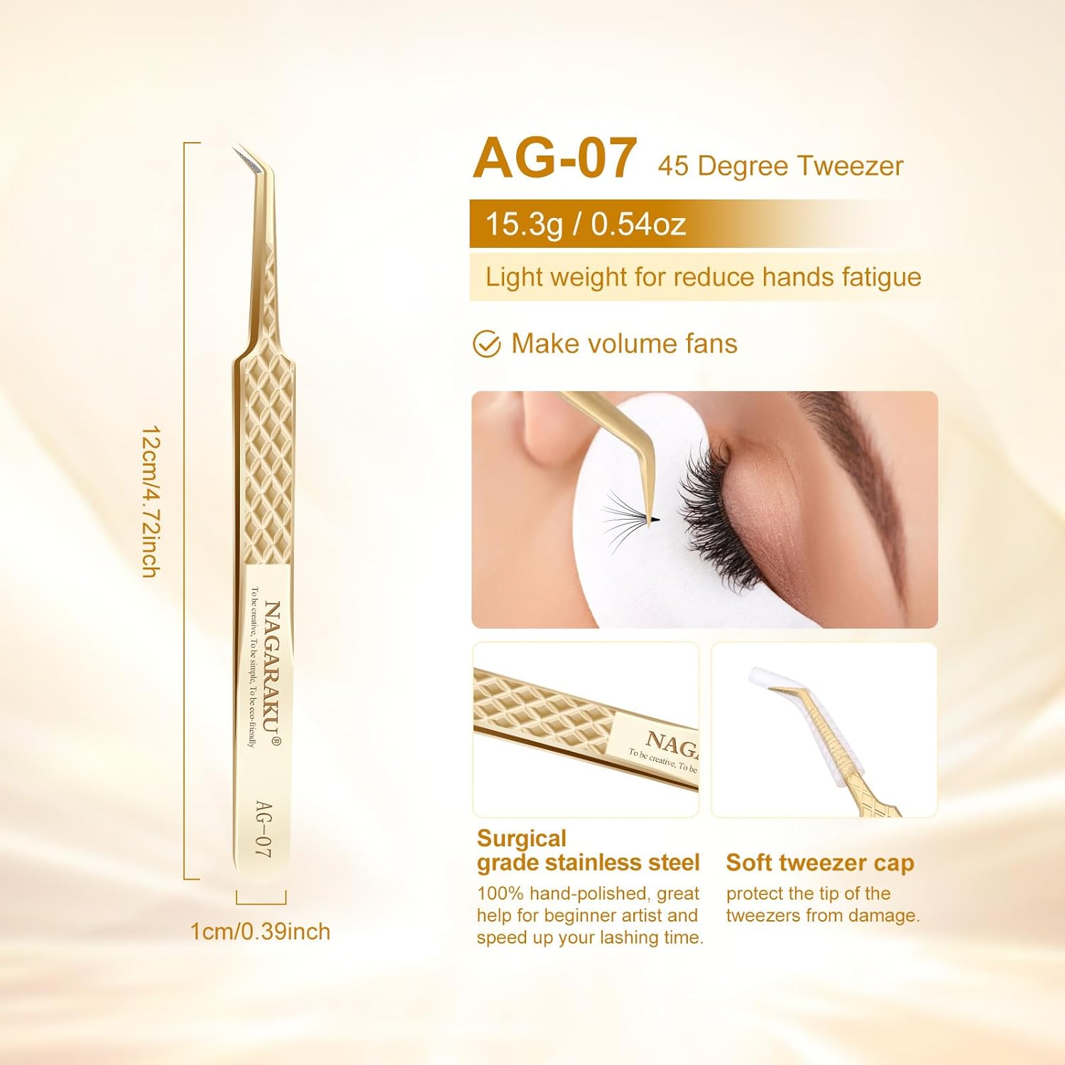 • 【45°Volume Tweezers AG-07】Colour: Gold / Length: 4.72 inches; Width: 0.39 inches. These handcrafted tweezers are made of high-strength stainless steel, which is resistant to most acids and other corrosive agents. We give each tweezer a box to protect the tweezers.