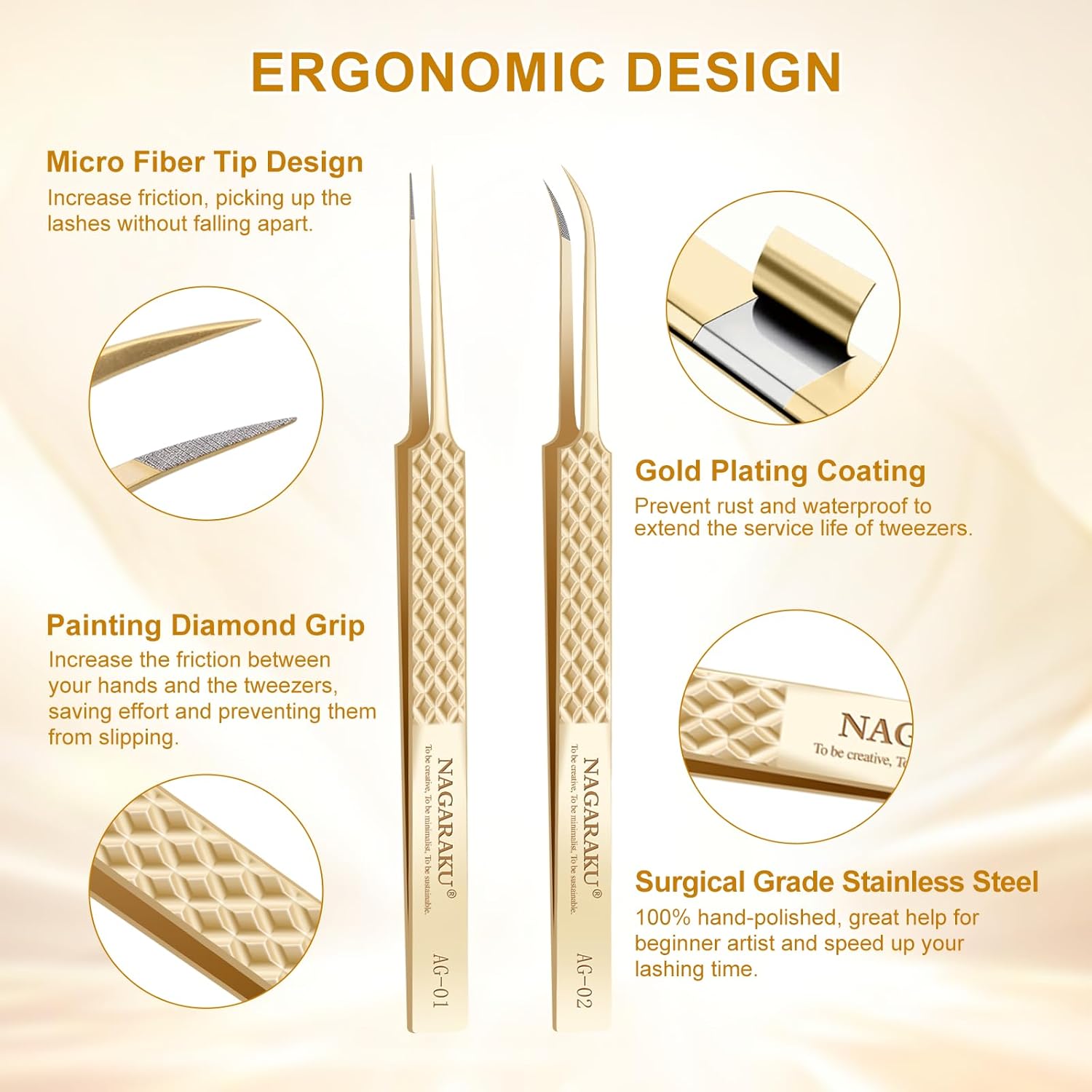 • 【AG-01+AG-02】Set of straight tweezers and curved tweezers. These handcrafted tweezers are made of high-strength stainless steel, which is resistant to most acids and other corrosive agents. We give each tweezer a box to protect the tweezers.