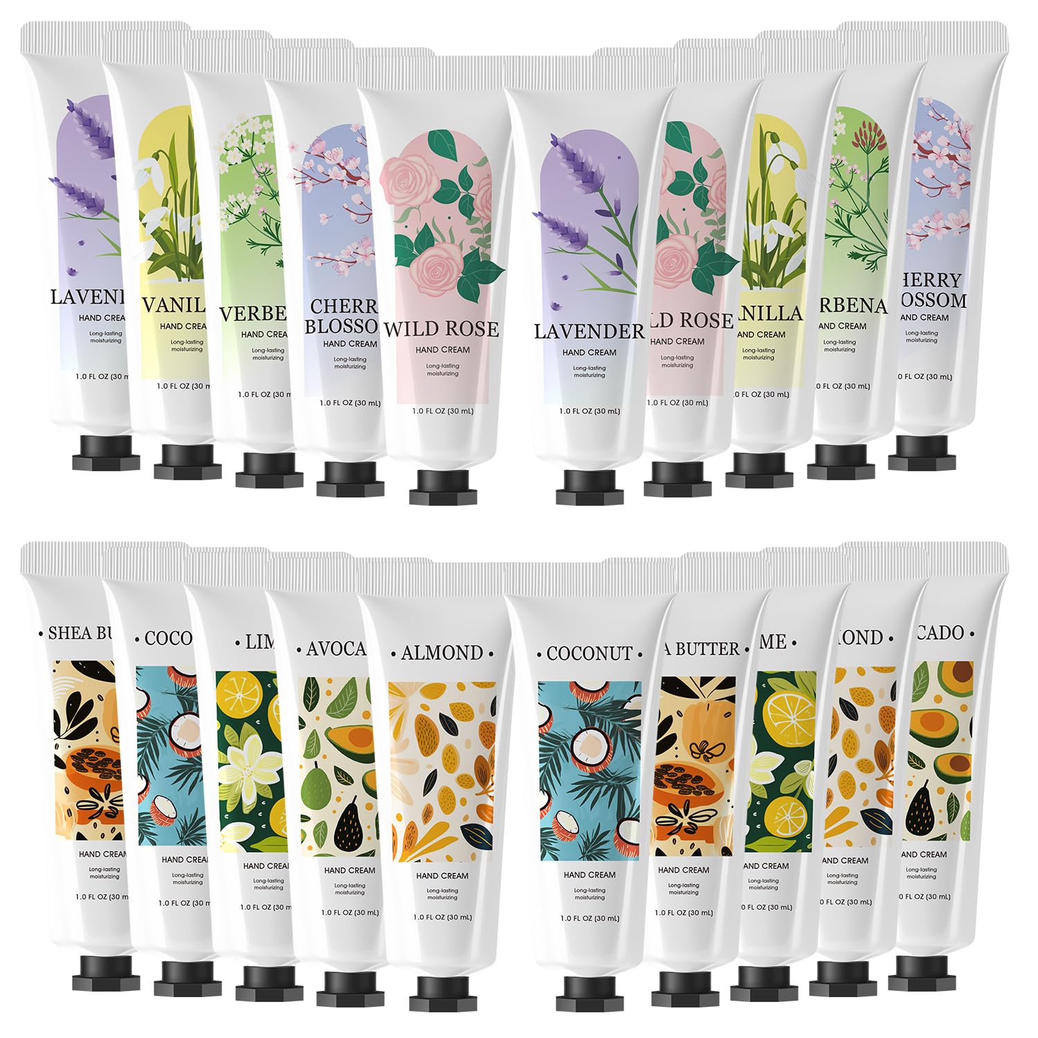 • 20 Pack and 10 Natural Scents for Every Mood – This hand cream set includes 10 delightful scents: lavender, vanilla, verbena, cherry blossom, wild rose, shea butter, coconut, lime, avocado, and almond. Each scent is naturally refreshing, making this hand lotion gift set both versatile and enjoyable for daily use. Perfect for anyone who loves a variety of mini hand lotion options.