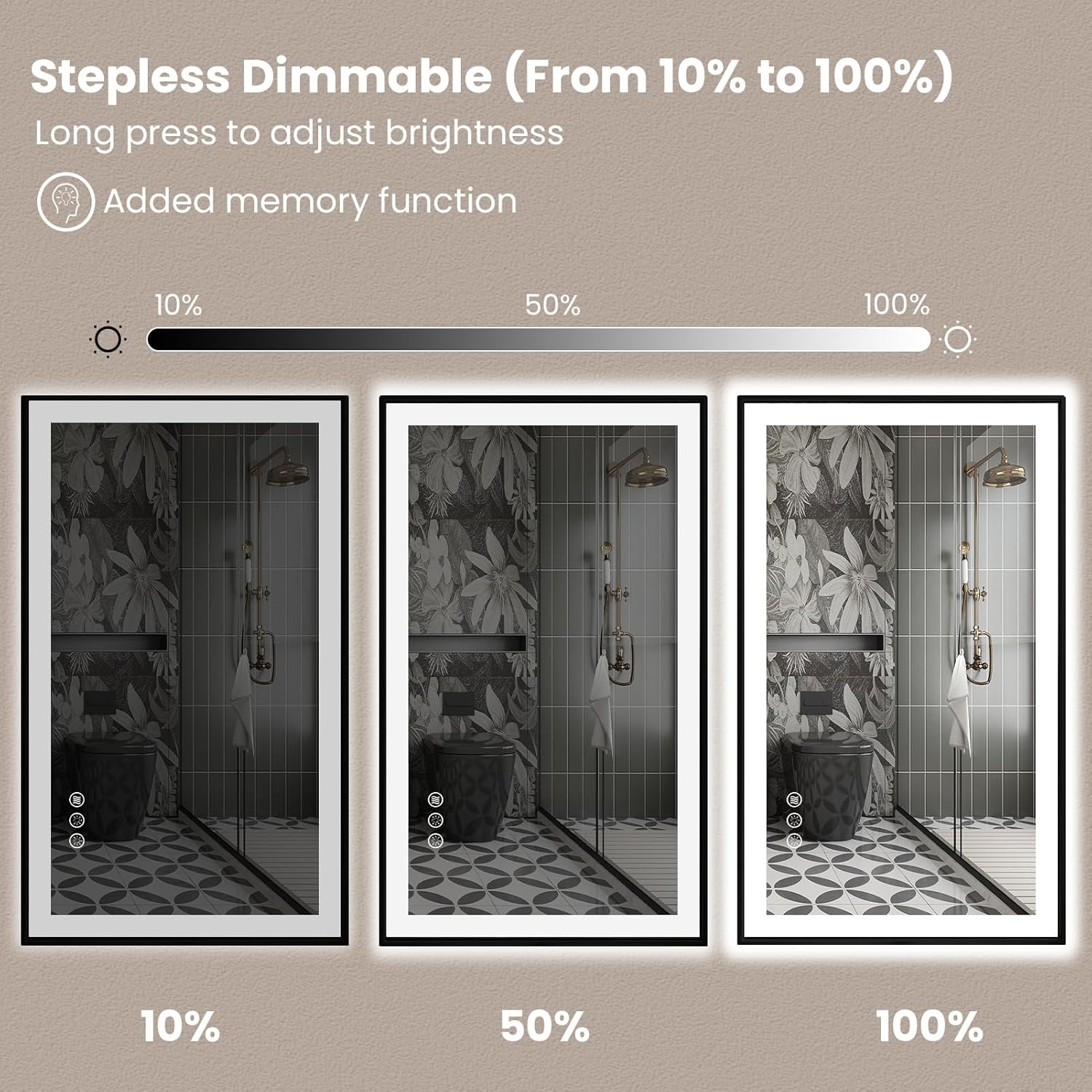 • [Anti-fog]: After a few minutes of opening the defogger, the heater in the mirror will disperse the fog from the center to sides, the mirror will still reflect clearly in the bathroom surrounded by hot air; It will turn on with the power on and automatically turns off after 1 hour