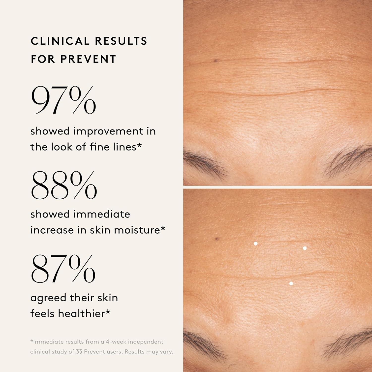 • CLINICAL RESULTS: In an Independent Clinical Study, 97% of Prevent users showed an improvement in the appearance of fine lines and wrinkles, and 88% showed an immediate increase in skin moisture.*