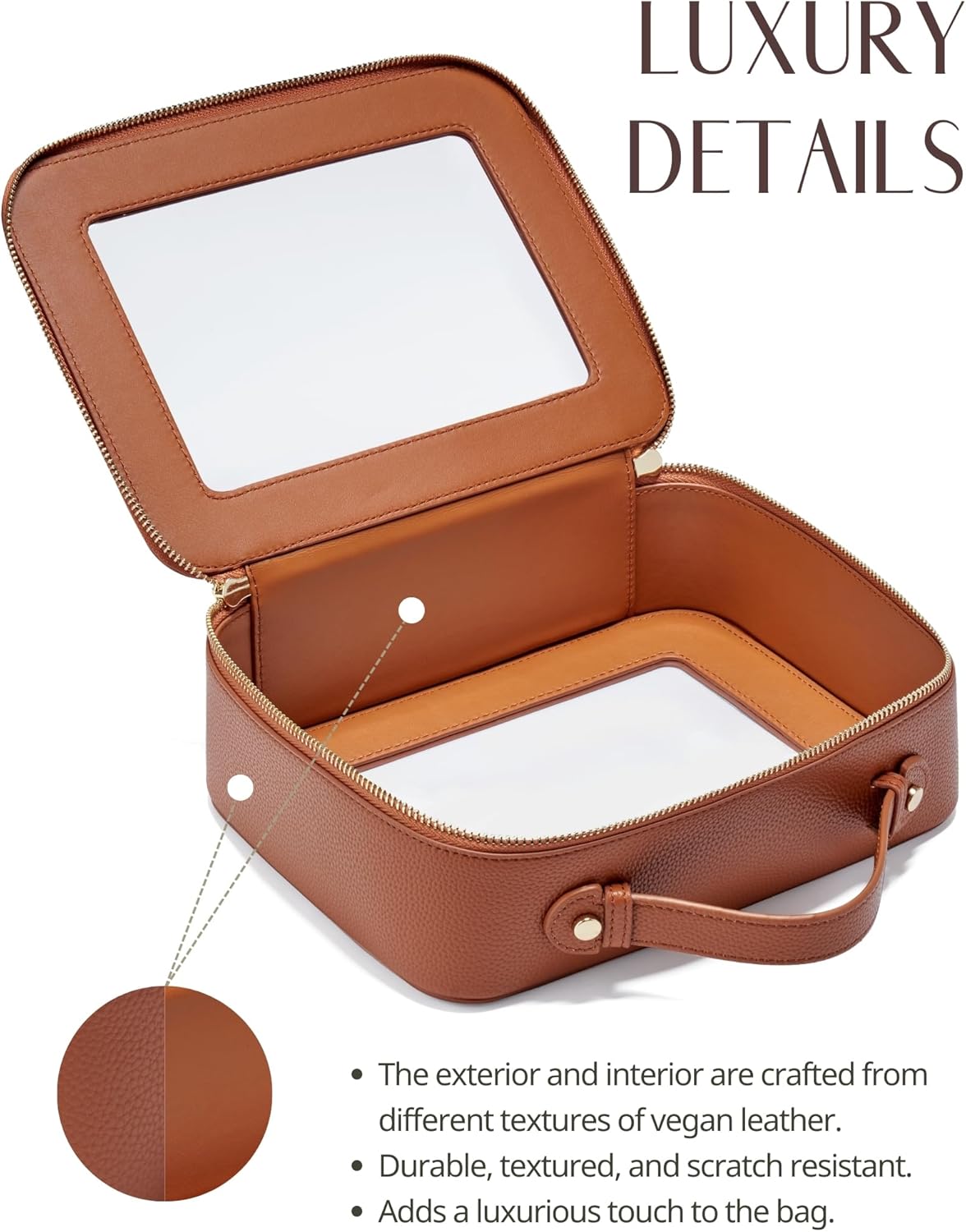 • [Spacious and Roomy] – The brown travel make up bag measures 9.6'' x 7.5'' x 3.1'' (24.5cm x 19cm x 8cm), ideal for extended trips or situations where you need to carry a comprehensive collection of makeup and skincare products. It is designed to fit comfortably in suitcases and big travel bags.