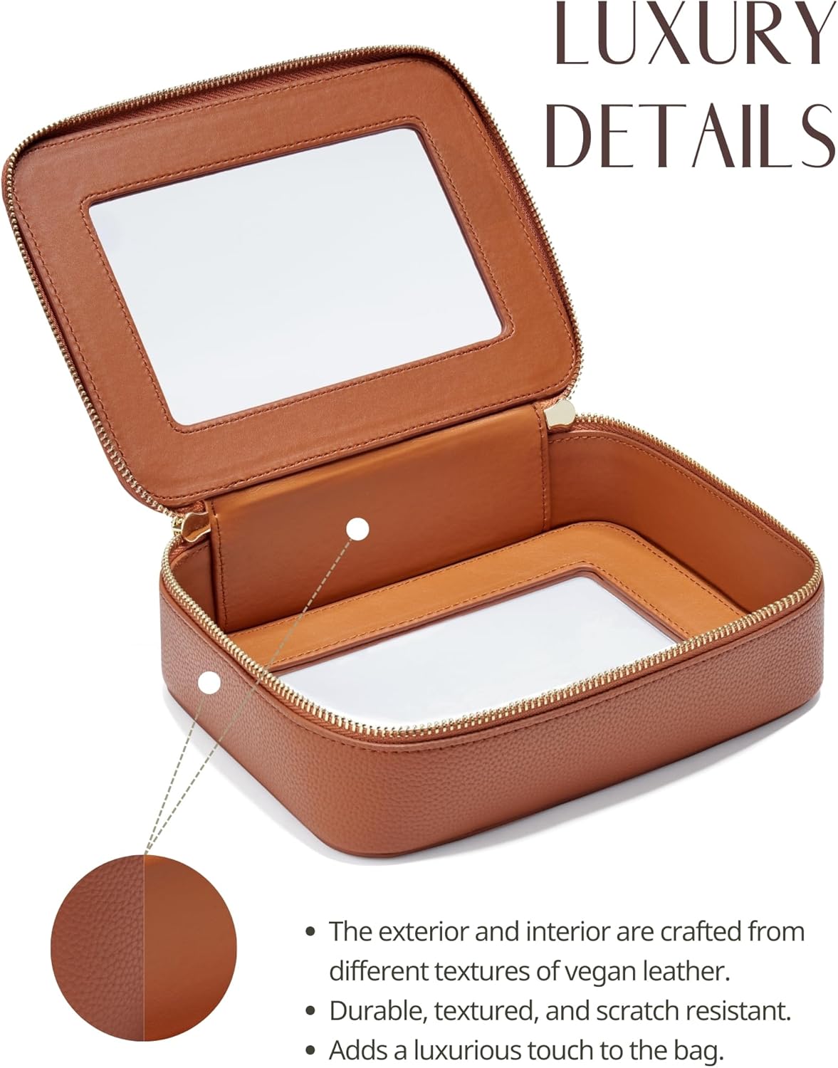 • [Premium Material and Durability] – The clear cosmetic case, both the exterior and interior, is crafted from high-grade faux leather, which is highly scratch resistant, durable and exceptionally easy to keep clean. It features a smooth zipper for secure closure, and elegant light gold metal hardware accents, adding a luxurious and sophisticated touch to the bag's overall design.