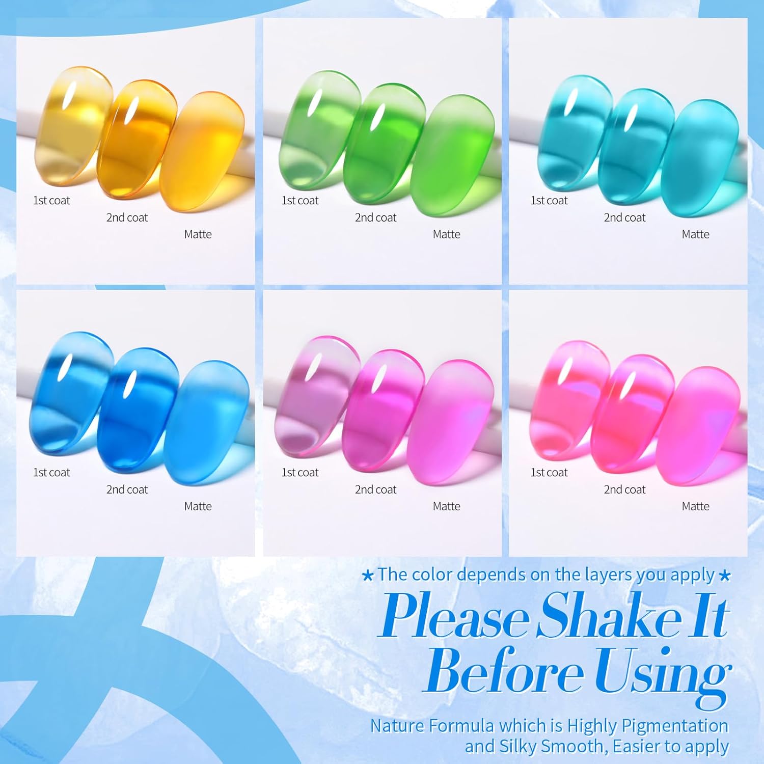 • PACKAGE CONTENTS:6 Bottles BORN PRETTY Neon ice jelly gel nail polish set.Jelly gel nail polish is a popular nail trend that gives your nails a glassy, see through appearance effect similar to jelly.The jelly nail polish color different from ordinary gel nail polish.It is a ice jelly nail gel. 1 layer, 2 layers and 3 layers are different effect.