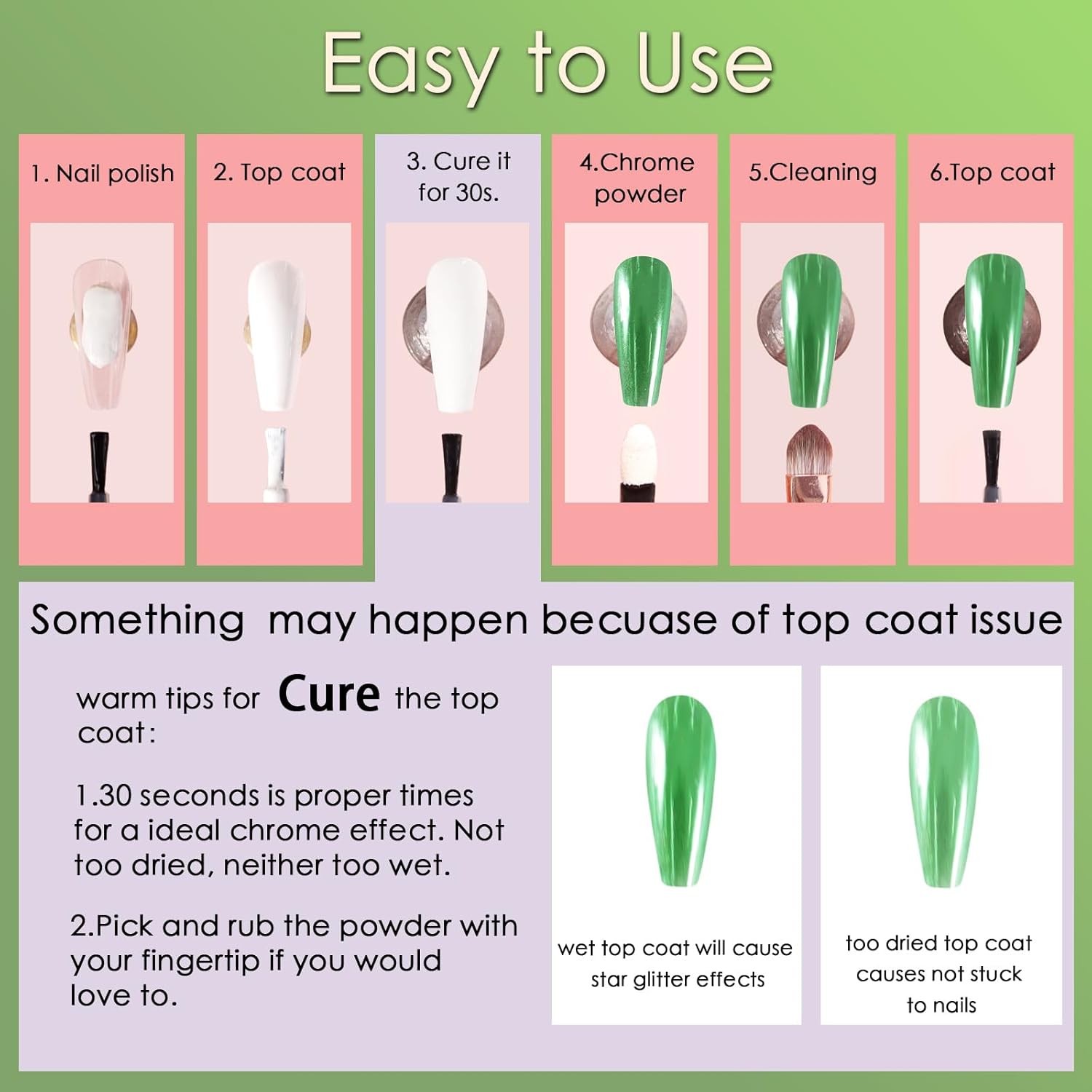 • Ultra Excellent Texture: The green chrome nail powder is fine and smooth without particles feeling, so you can make your st patrick's day nails exquisite with an amazing mirror effect. And the nail dipping powder is non-toxic, more durable, and environmentally friendly, which does not harm your nails and skin, using it more at ease. Make mirror effects for your nails with our excellent equality nail chrome powder set.