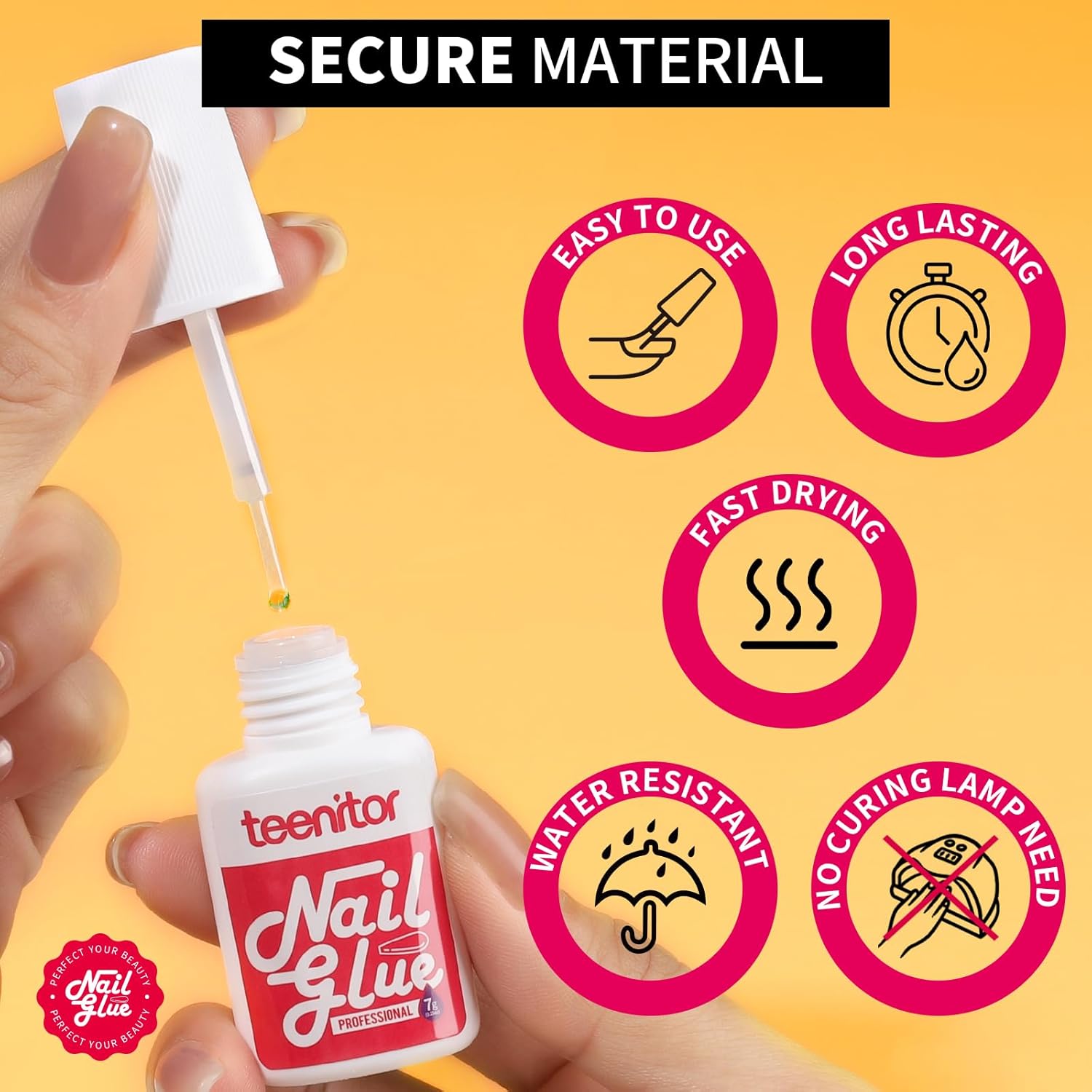 • Super Strong & Dry in 5 Second: Our Teenitor 7g strong nail glue for press on nails is made of premium quality nail pink glue which is different from others, easy to dry in 5 second, strong adhesive allow long lasting to 14-21 days-Easy to Use, Long Lasting, Fast Drying, Water Resistant and No Curing Lamp Need; seal design of bottle will not leak easily and better keep the glue