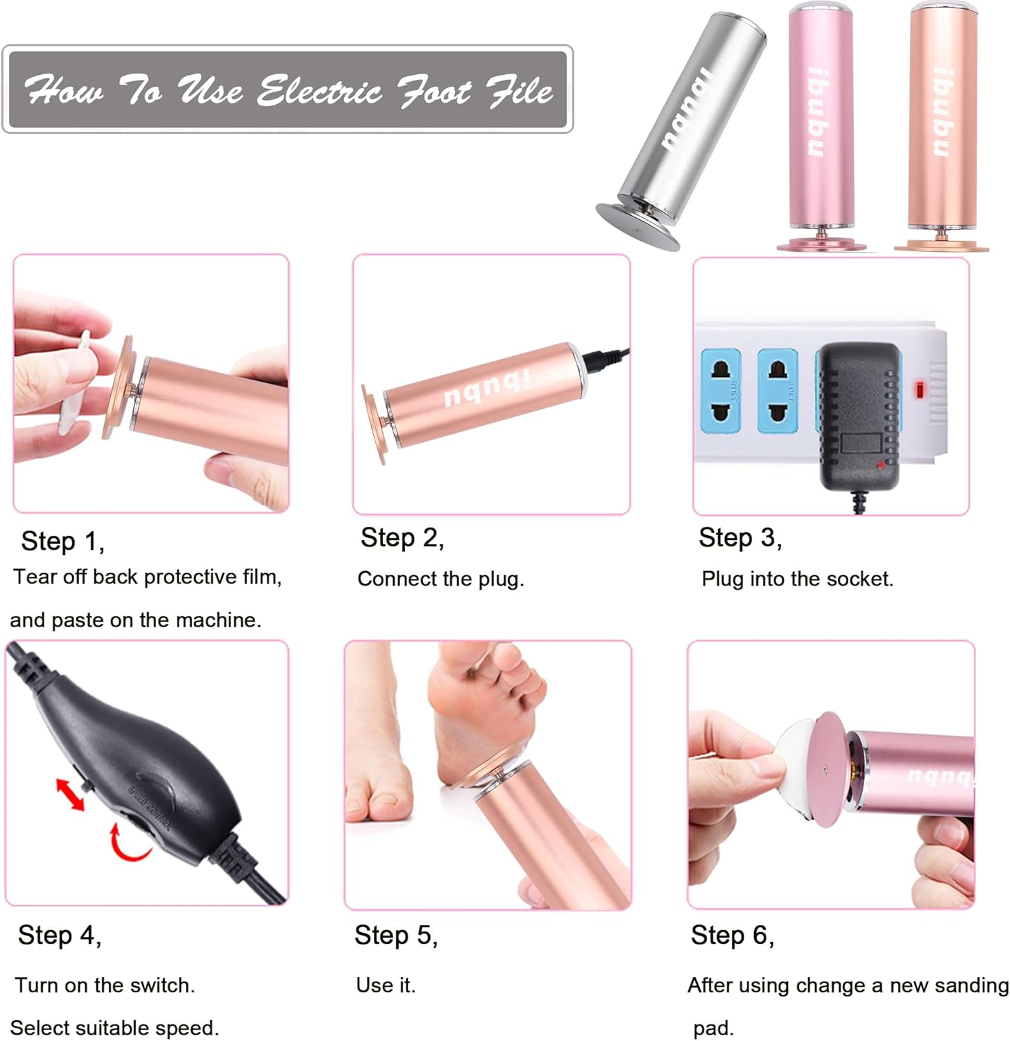 • 【Adjustable Speed】ibubu's foot pedicure dead skin remover with an independent speed controller, you can freely adjust the speed from 0-600 rpm through the knob, you can get best foot callus removal effect. Please note that this electric foot exfoliating tool is only suitable for normal foot dead skin, NOT FOR thick dead skin, calluses! NOTE: Initial startup, The Speed Controller to the lowest speed, and then turn on
