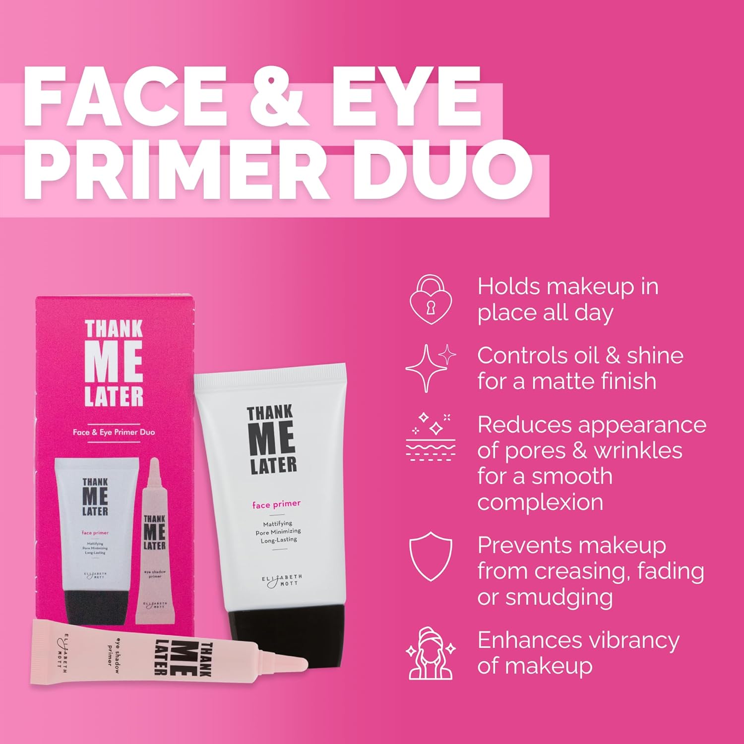 Elizabeth Mott Thank Me Later Face & Eye Primer – Long-Lasting Matte Makeup Base, Pore Minimizer, Oil & Shine Control, Wrinkle Blurring, Crease Prevention, Smooth Finish for All-Day Wear – 10g & 30g