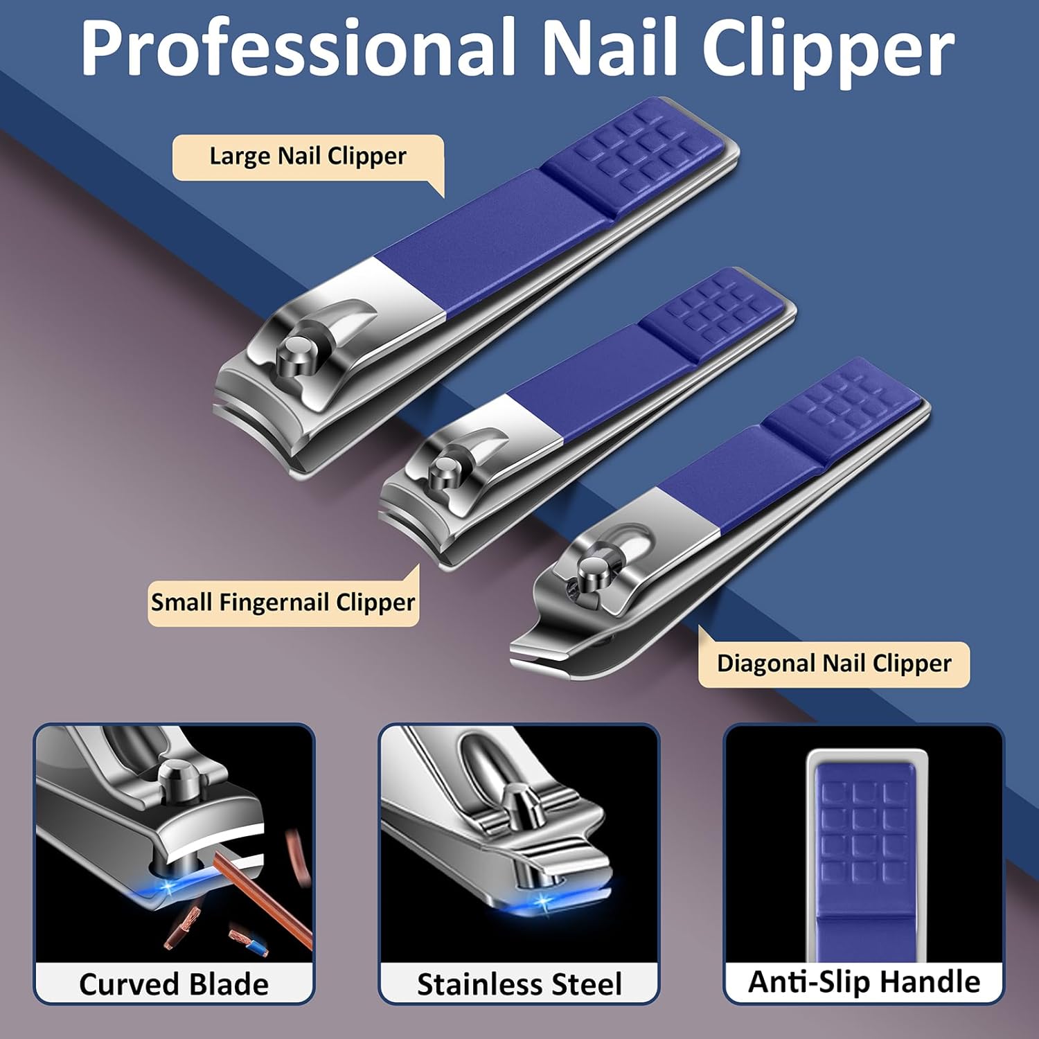• Professional Nail Kit Manicure Set: Nail set manicure made of high-quality material. Manicure pedicure kit have 3 different nail clippers, including large nail clipper, small nail clipper and diagonal nail clipper. Nail clipper set are sharp and durable. Keep your nails trimmed and free of spills, cracks and hangnails.
