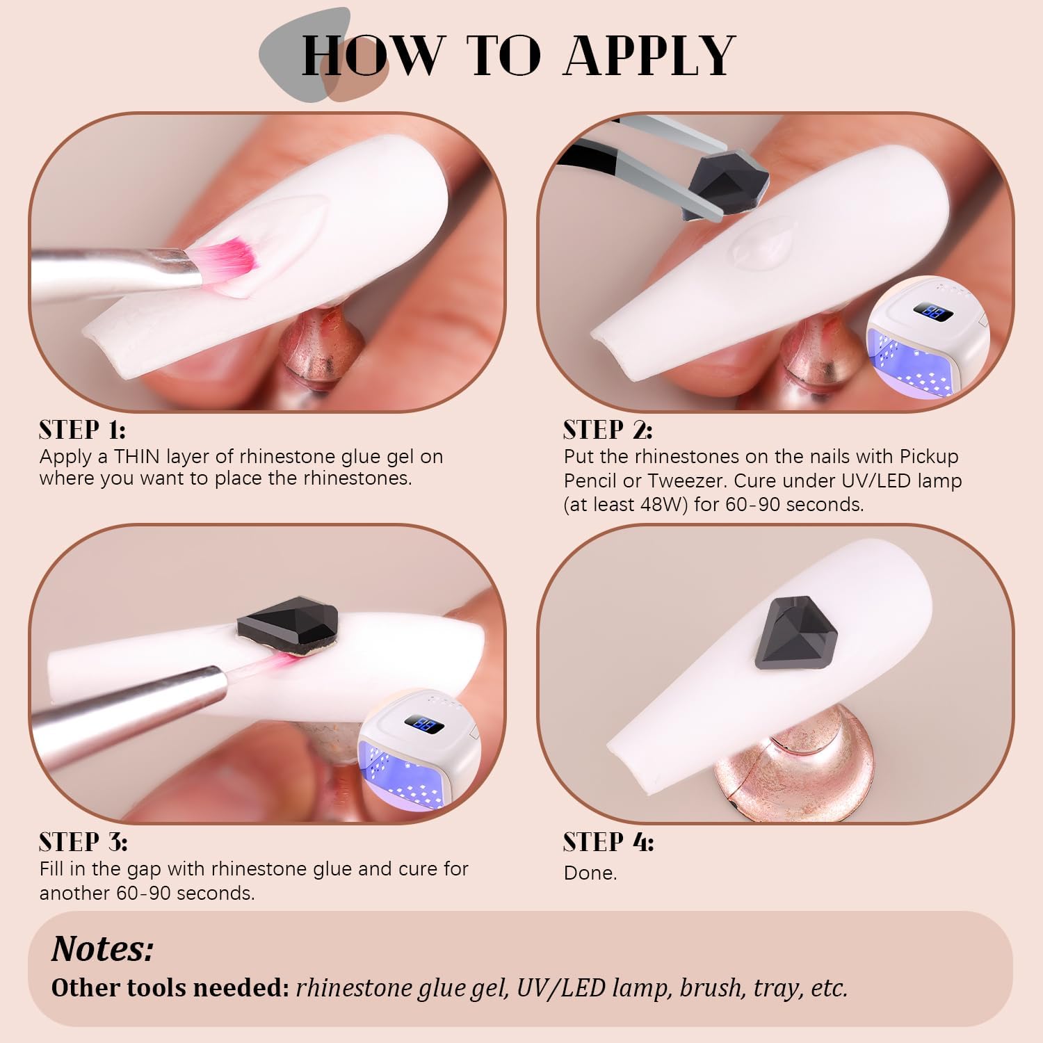 • 💎EASY TO USE -- Easy to apply on artificial nails. After applying nail polish and applying enough gel on the nails, simply use the equipped tools (pickup pen + tweezers) to pick up the crystals onto your nails to create your fabulous DIY designs! These crystals gemstones are different from those hotfix stones, they are not self-adhesive, you have to apply glue to stick them (glue is not included.)