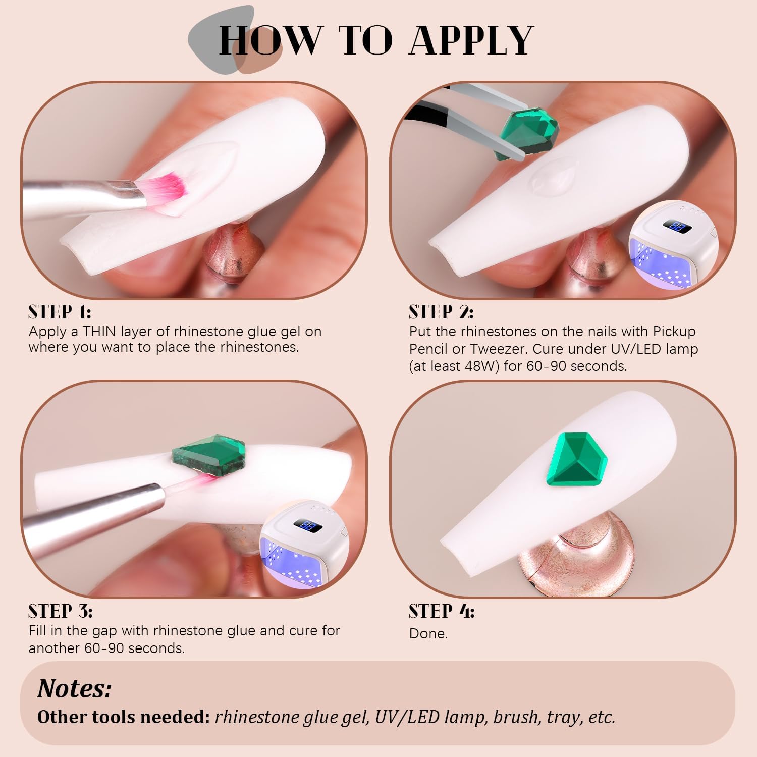 • 💎EASY TO USE -- Easy to apply on artificial nails. After applying nail polish and applying enough gel on the nails, simply use the equipped tools (pickup pen + tweezers) to pick up the crystals onto your nails to create your fabulous DIY designs! These crystals gemstones are different from those hotfix stones, they are not self-adhesive, you have to apply glue to stick them (glue is not included.)