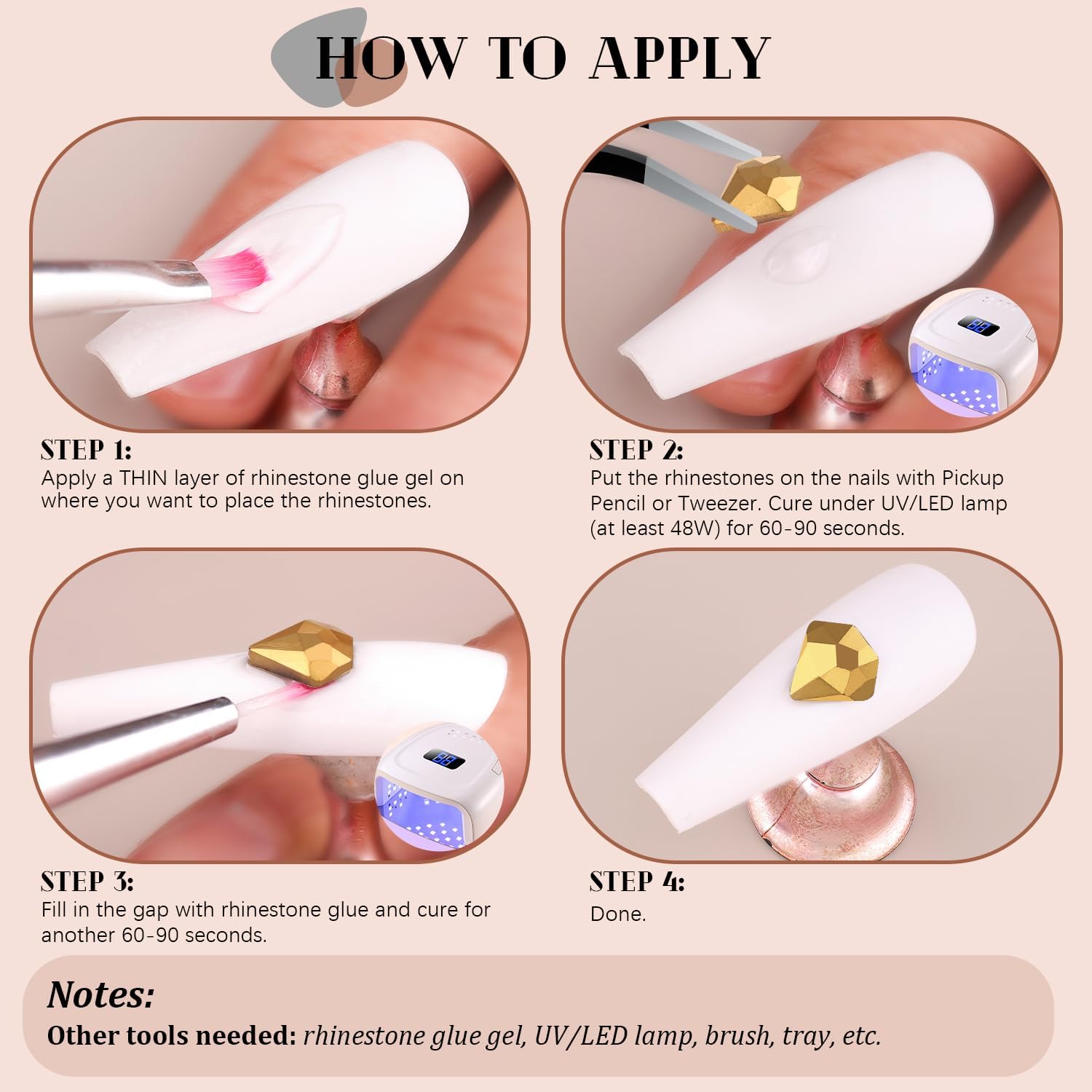 • 💎EASY TO USE -- Easy to apply on artificial nails. After applying nail polish and applying enough gel on the nails, simply use the equipped tools (pickup pen + tweezers) to pick up the crystals onto your nails to create your fabulous DIY designs! These crystals gemstones are different from those hotfix stones, they are not self-adhesive, you have to apply glue to stick them (glue is not included.)