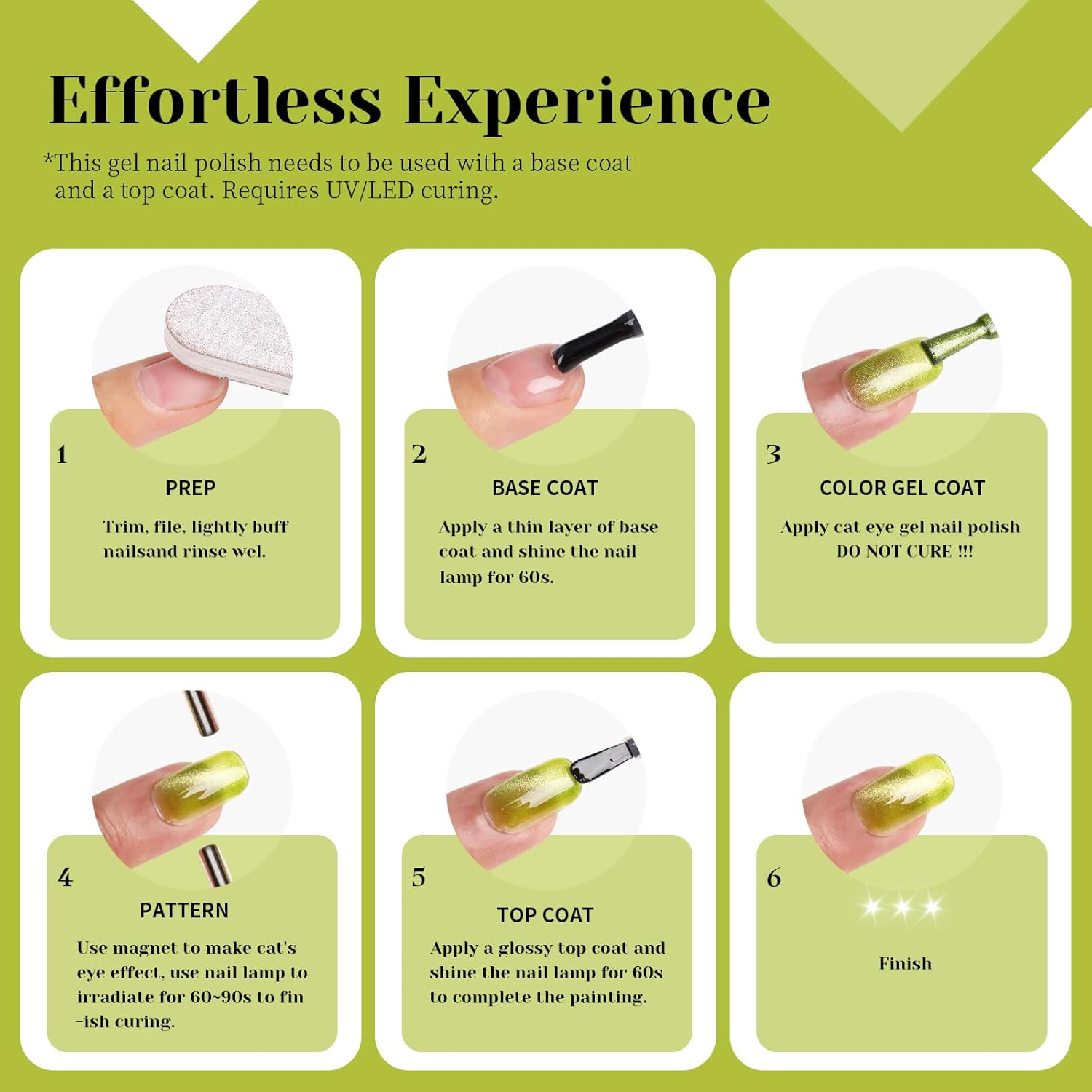 • Our cyber lime green cat eye gel nail polish is formulated to be long-lasting and durable. It can withstand daily wear and tear, ensuring that your manicure stays flawless for weeks. Say goodbye to chipped or faded nails with our high-performance gel formula.