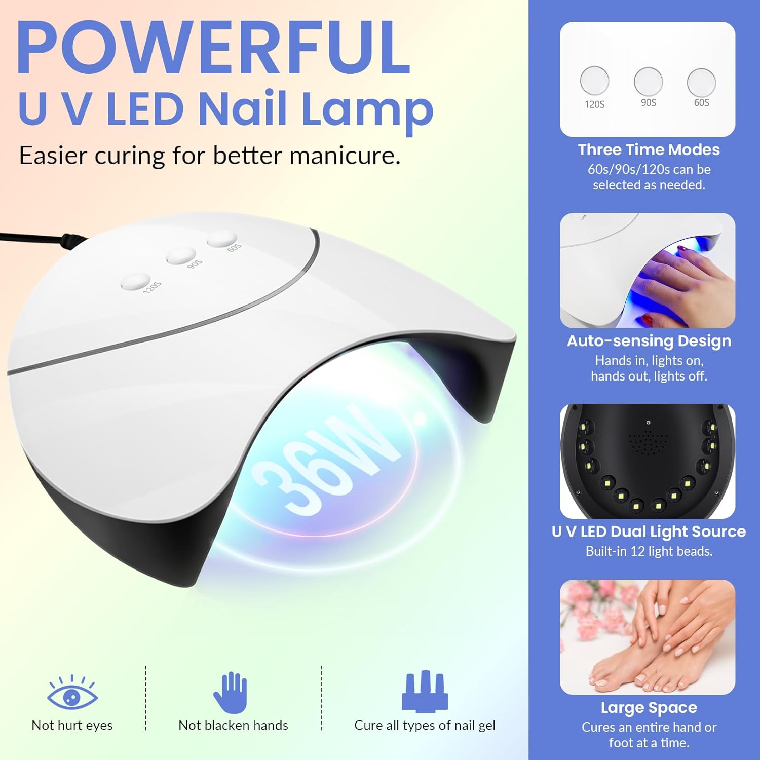• 【Powerful U V/LED Nail Lamp】 Professional nail light in this gel nail polish kit has three time options: 60s/90s/120s, and automatic sensor design, allowing you to easily control the curing of gel nail polish. U V/LED dual light source design, with 12 lamp beads, can efficiently cure almost all kinds of nail gels, not hurt your eyes, not black hands. Enough space to cure a whole hand or foot, bring you high quality nail art curing experience.