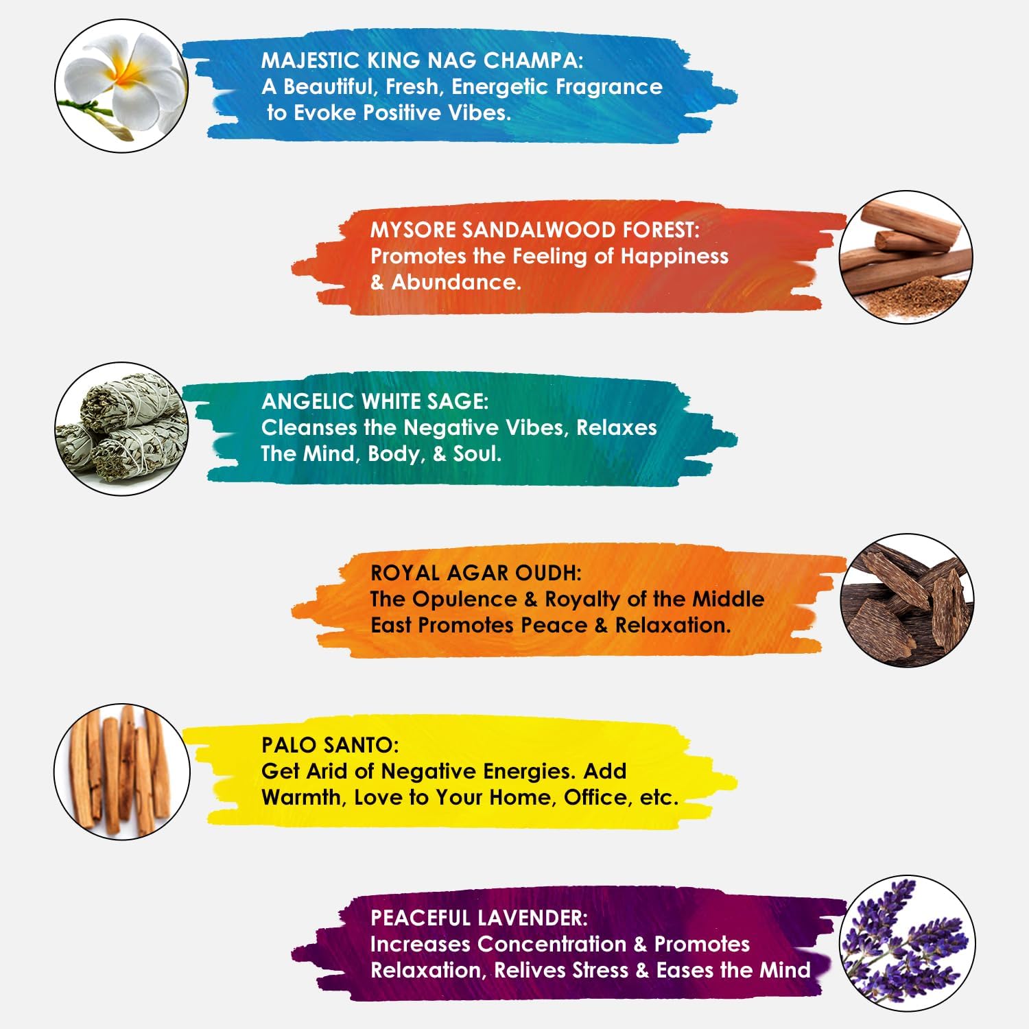 • 🌿 All-Natural Variety Pack – 6 Calming Fragrances for Every Mood: Indulge in a curated selection of natural incense sticks with 6 distinct fragrances: Sandalwood, Nag Champa, Agar Oudh, Palo Santo, White Sage, and Lavender. This value incense gift set includes 120 hand-rolled, non-toxic sticks, each infused with traditional Ayurvedic essential oils. Ideal for those seeking aromatherapy incense, meditation accessories, or a spiritual cleansing tool.