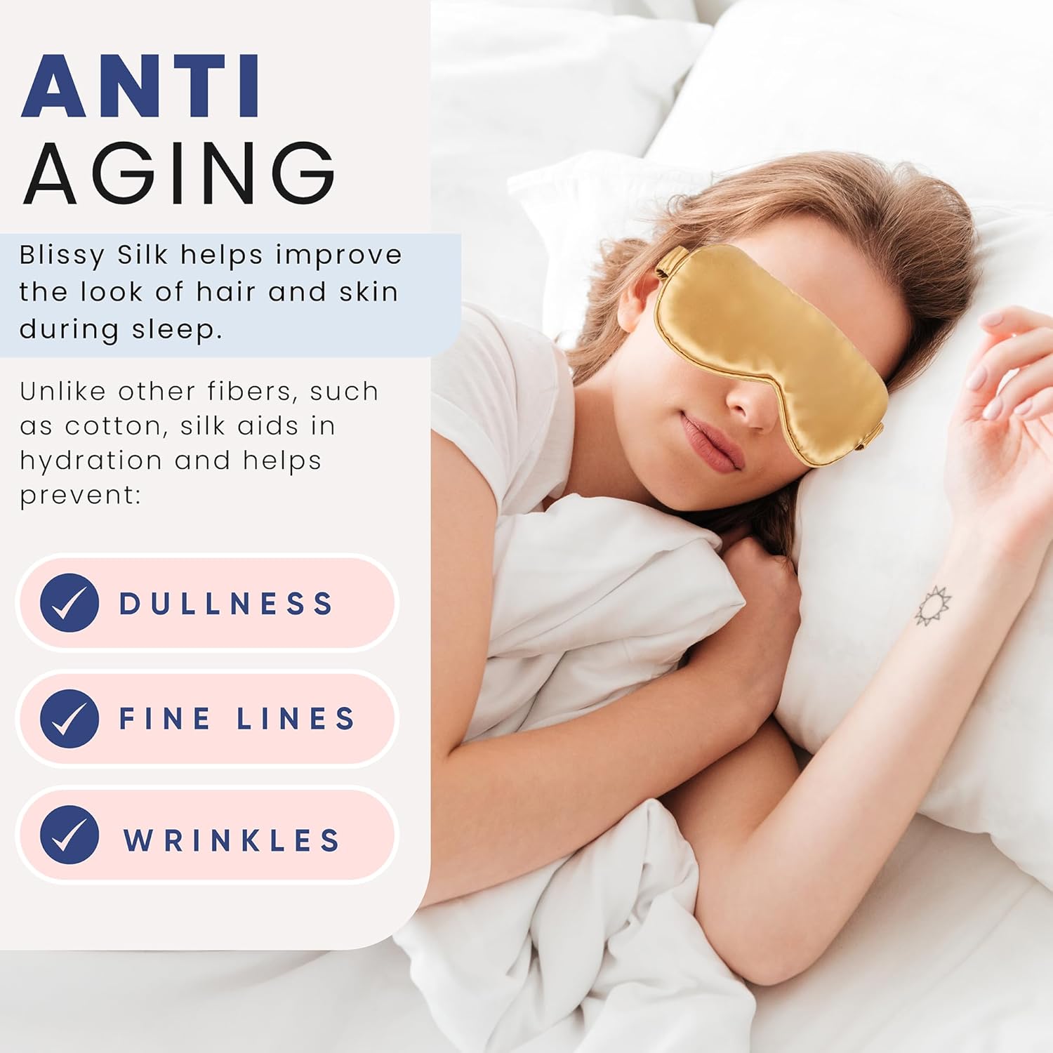 • ANTI-AGING - Blissy Silk helps improve the look of hair and skin during sleep. Unlike other fibers, such as cotton, silk aids in hydration and helps prevent dullness, fine lines, and wrinkles.