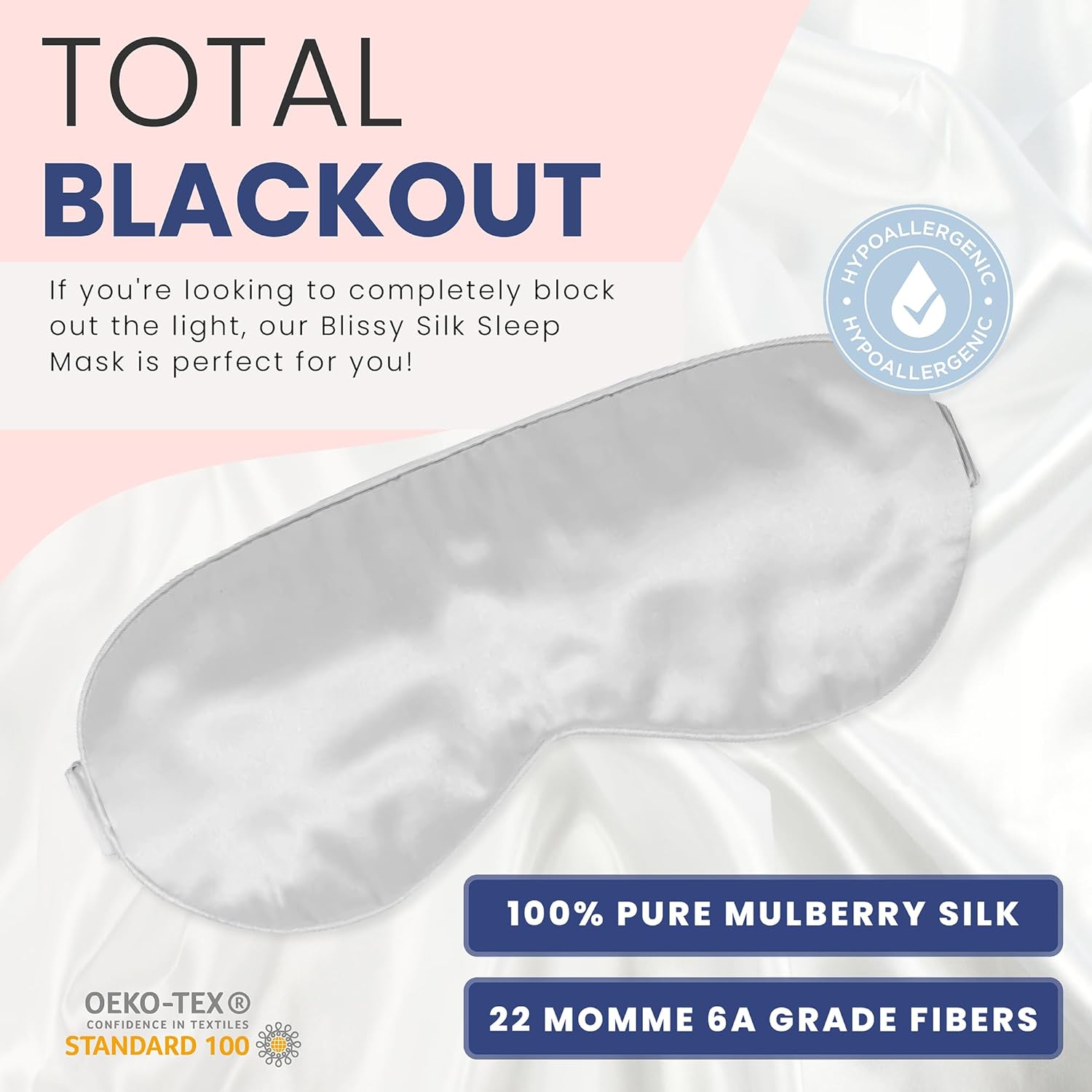 • TOTAL BLACKOUT - If you're looking to completely block out the light, our Blissy Silk Sleep Mask is perfect for you! Made with 100% pure Mulberry silk and 22 momme 6A grade fibers, this mask will keep the light out and help you get a good night's sleep.