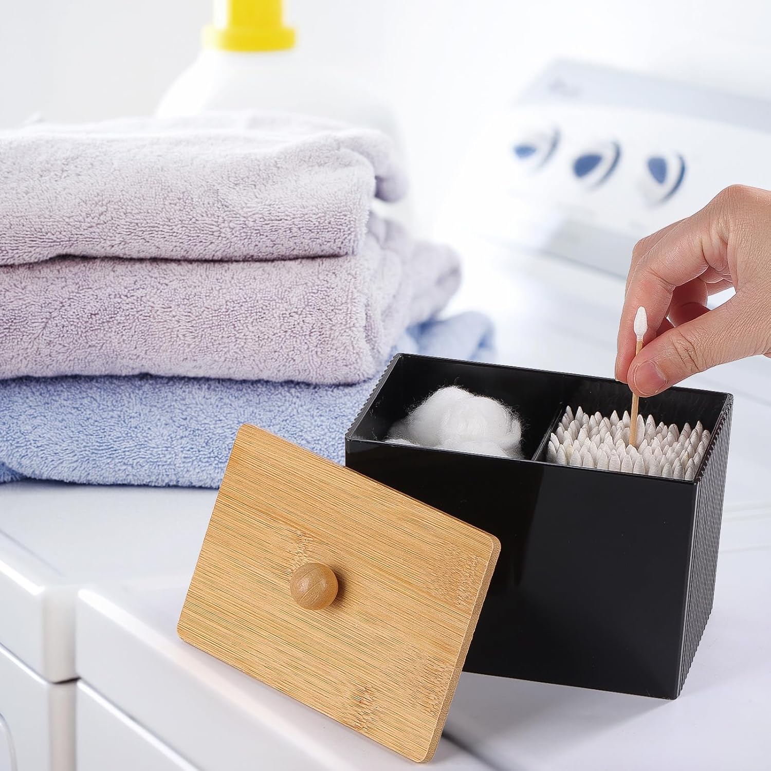 • The Qtip holder can store cotton rounds/swabs/balls, floss picks, and other bathroom accessories.