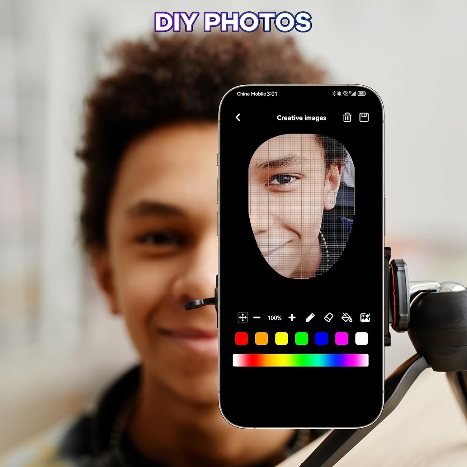 • Multifunctional LED Mas k- Easily control the mask's lighting through the SHINING DISPLAY APP on your phone. You can add photos or DIY text to this LED mask. If you play music in the app, the audio will be displayed on the glowing mask.