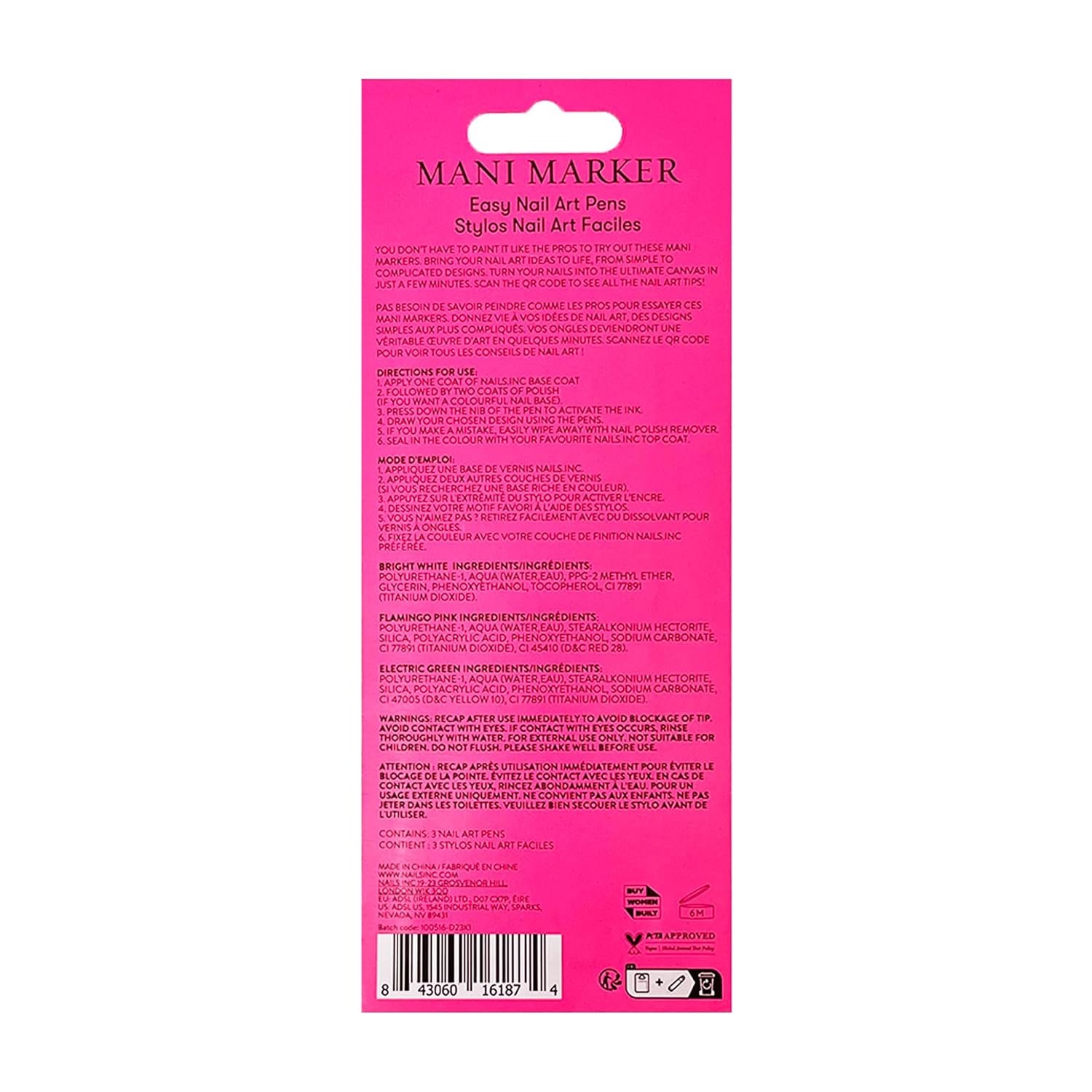 • Included Components : BRIGHT WHITE MANI MARKER, FLAMINGO PINK MANI MARKER, LIME GREEN MANI MARKER