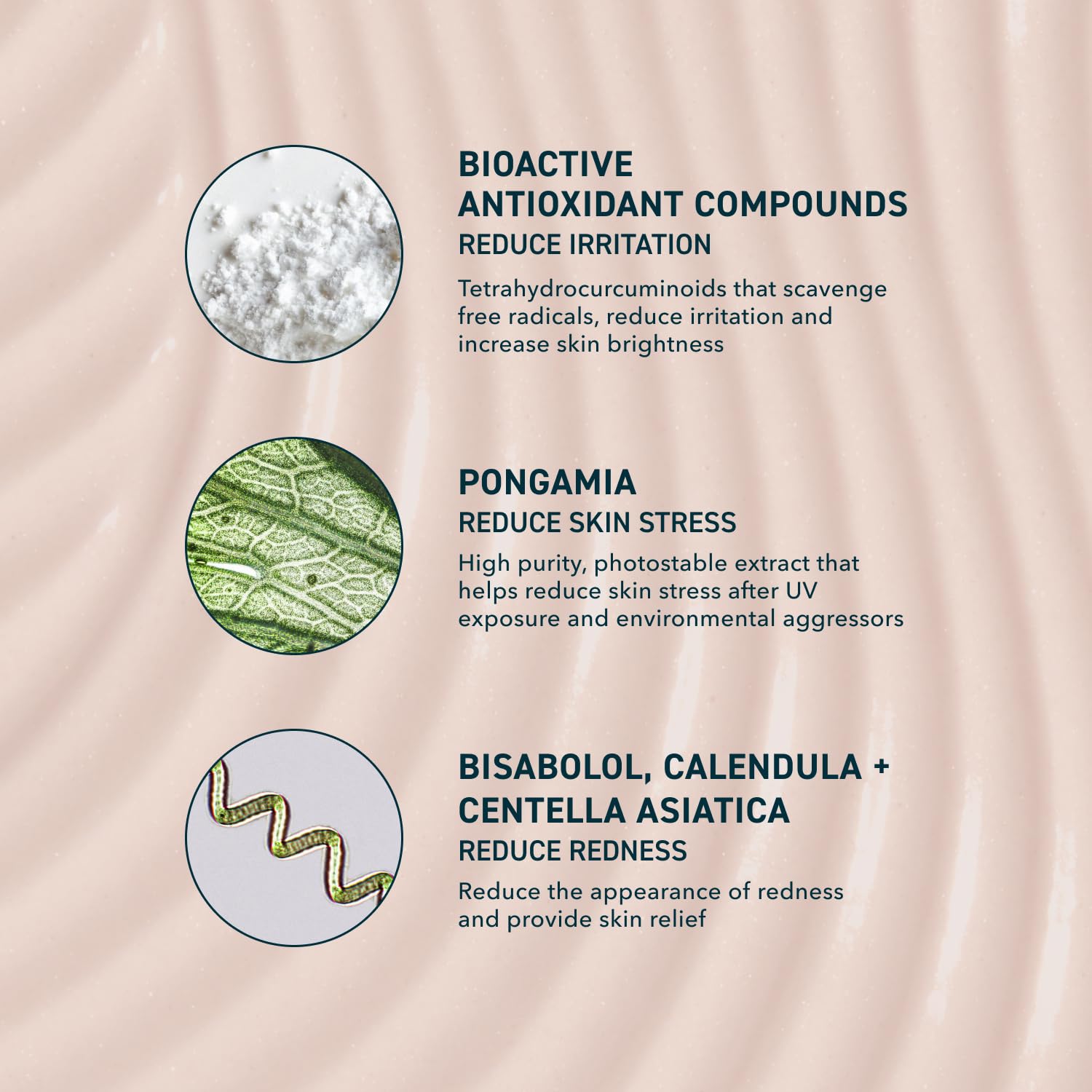 • ANTIOXIDANT SUPPORT. Features tetrahydrocurcuminoids to support skin against environmental stressors, while Pongamia Extract helps address skin stress from UV and impurities. Bisabolol, Calendula, and Centella Asiatica visibly reduce the appearance of redness for soothed skin