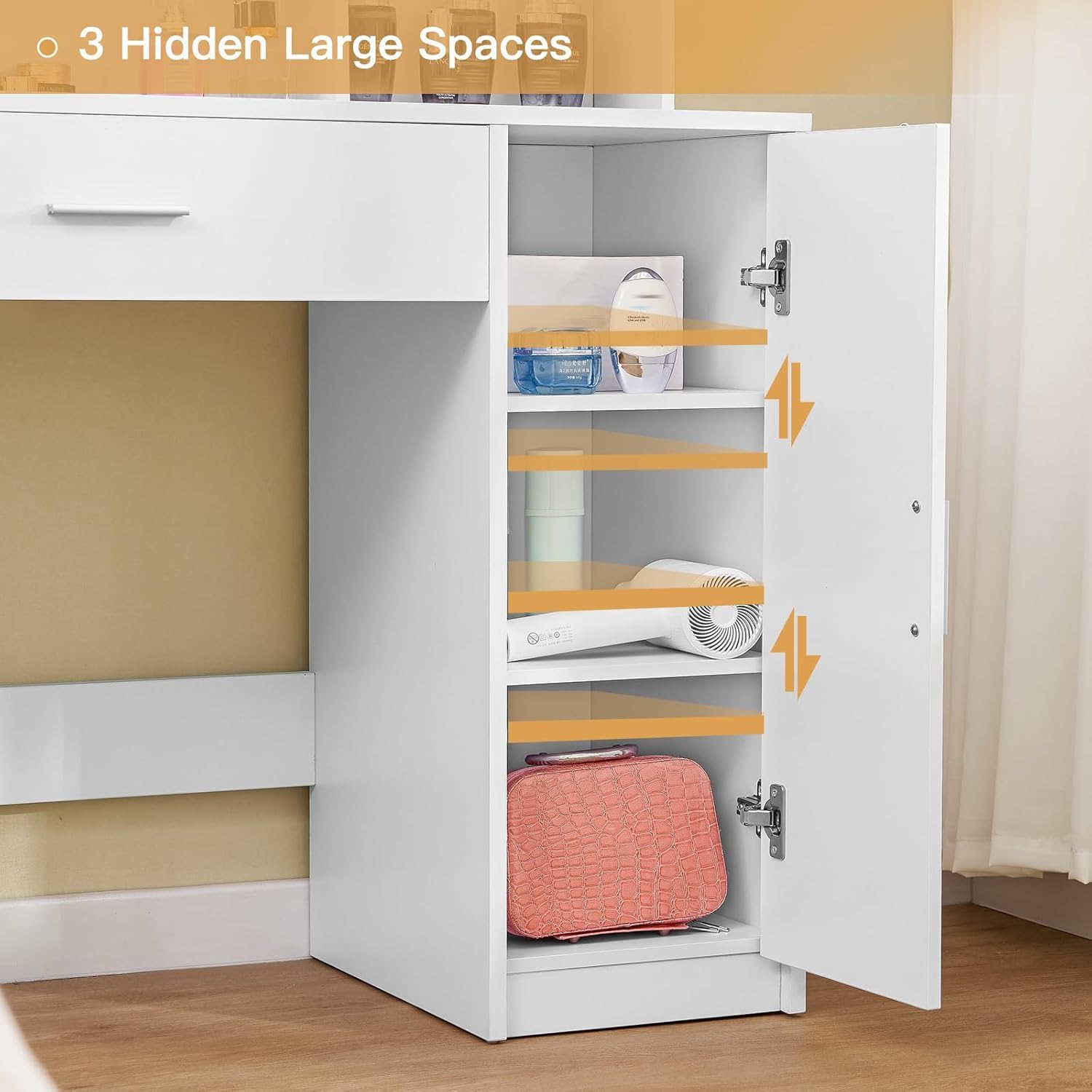 • 【Large Storage】This vanity desk contains 1 oversize drawer, 3 open shelves and 1 large cabinet with 2 height adjustable shelves, provide ample space for all your cosmetics, skin care products, jewelry and other beauty supplies. The dividers in the large cabinet below has three levels of storage to allow you to sorted and stored neatly items.