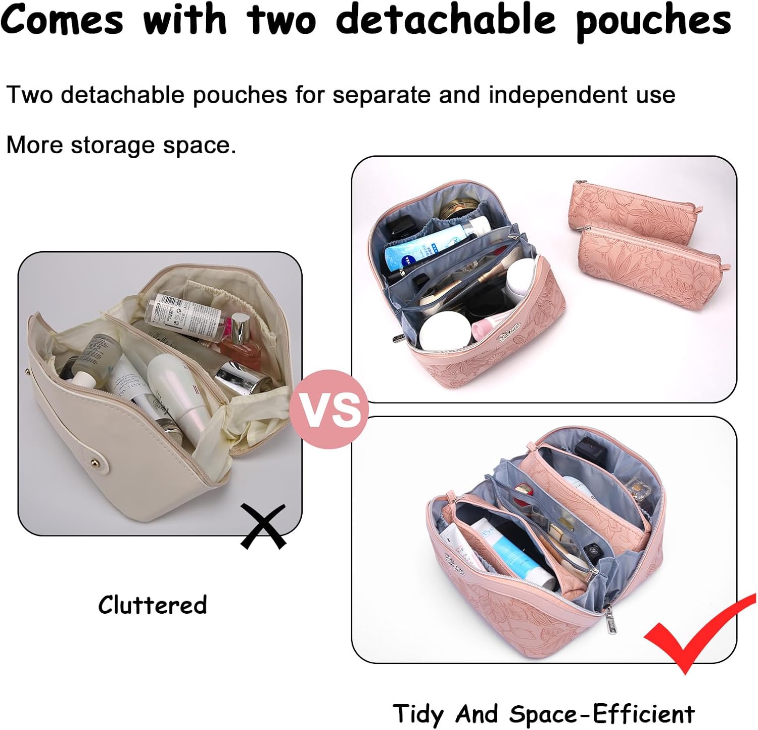 • 3 Pcs Makeup Bags Set: This travel make up bag comes with two detachable makeup pouches, ensuring optimal organization for your skincare products and cosmetics. Perfect for your travel, business trips, vacations, outdoor activities and picnics.