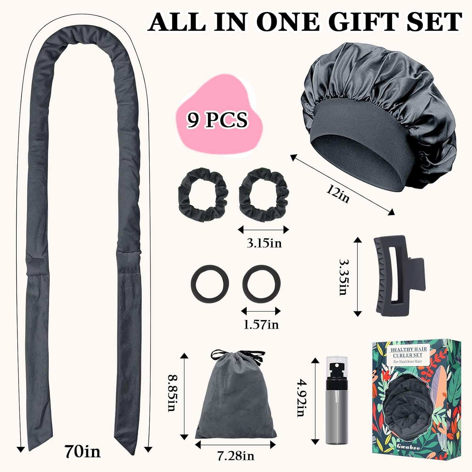 • WOMAN GIFT SET: Our hair curling set includes 9 items: 1 x 70-inch long velvet curling headband, 1 x satin hair bonnet for sleep, 1 x hair clip, 2 x velour hair ties, 2 x elastic hair ties, 1 x velour storage bag, and 1 x spray bottle. This all-in-one curling rods gift set is packaged in an exquisite box, making it the perfect gift for family, friends, and colleagues on various occasions, such as Christmas, New Year's Day, Birthdays, Mother's Day, Valentine's Day, and more