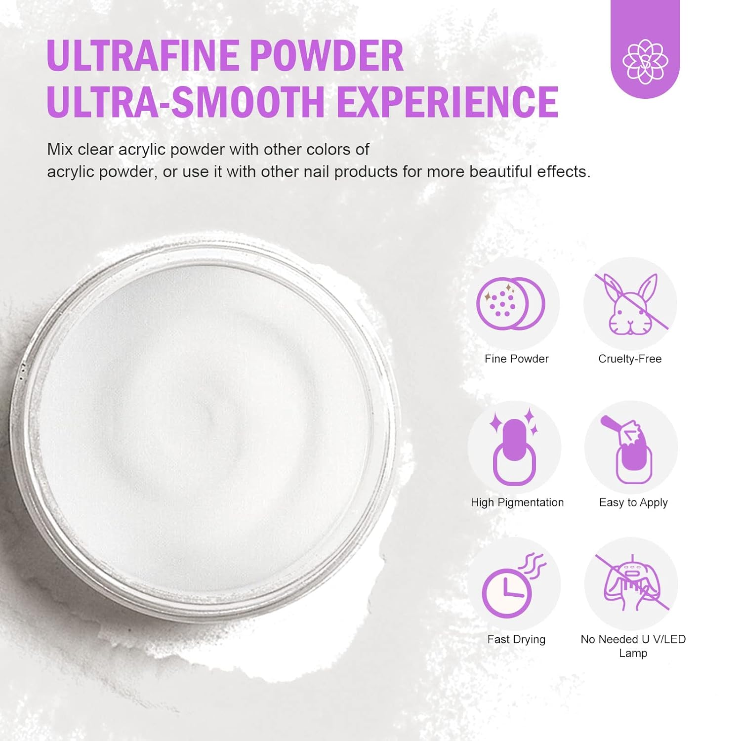 • Versatile Clear Acrylic Powder​​: Bubble-free ultra-clear acrylic nail powder is perfect for nail extensions, repairs, 3d carvings and decoration. Blends seamlessly with other colors for gradient effects, overlays and natural-looking, long-lasting acrylic nails