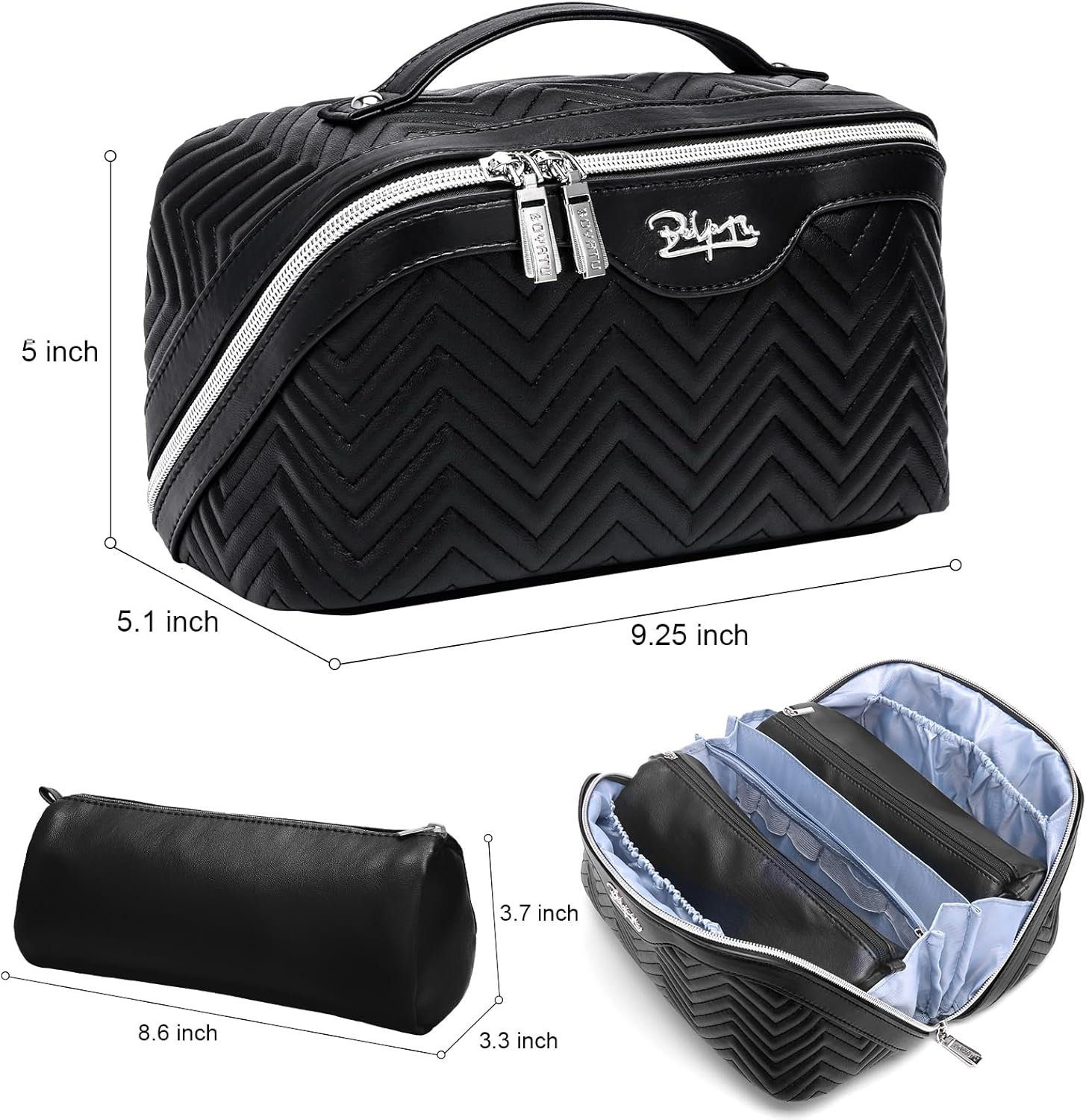 Travel Makeup Bags Cosmetic Organizer Bag: Quilted Make up Bag Set of 3 - PU Leather Toiletry Bags for Women - Portable Makeup Organizer with Compartments & Handle & Divider (14 Black New)